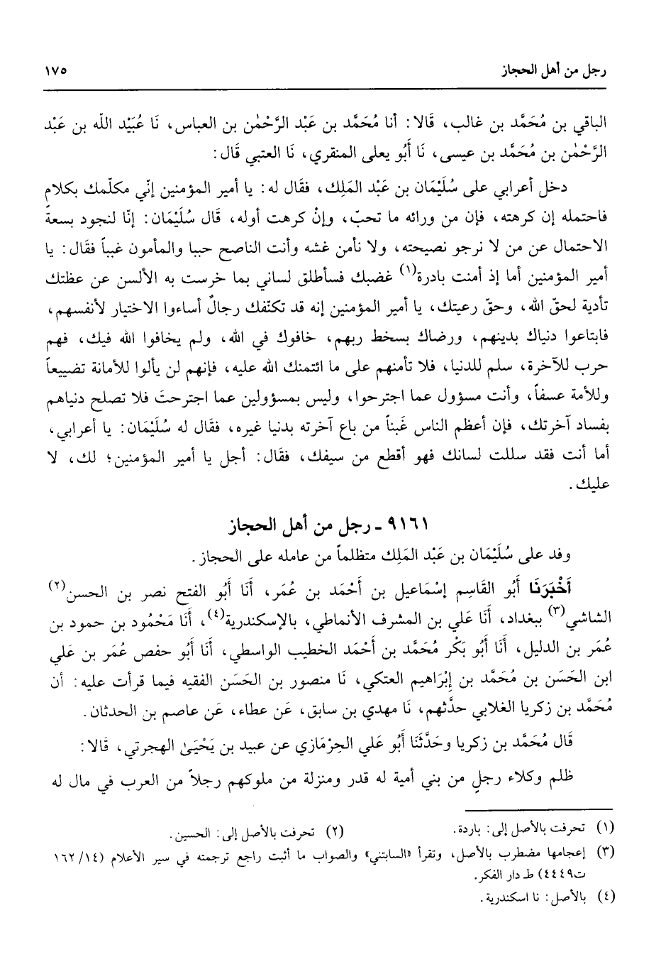 9161 - رجل من أهل الحجاز وفد على سليمان بن عبد الملك متظلما من عامله على الحجاز أخبرنا أبو القاسم إسماعيل بن أحمد بن عمر أنا أبو الفتح نصر بن الحسن (2) الشاشي (3) ببغداد أنا علي بن المشرف الأنماطي بالإسكندرية (4) أنا محمود بن حمود بن عمر بن الدليل أنا أبو بكر محمد بنأحمد الخطيب الواسطي أنا أبو حفص عمر بن علي ابن الحسن بن محمد بن إبراهيم العتكي نا منصور بن الحسن الفقيه فيما قرأت عليه أن محمد بن زكريا الغلابي حدثهم نا مهدي بن سابق عن عطاء عن عاصم بن الحدثان قال محمد بن زكريا وحدثنا أبو علي الحرمازي عن عبيد بن يحيى الهجرتي قالا ظلم وكلاء رجل من بني أمية له قدر ومنزلة من ملوكهم رجلا من العرب في مال له