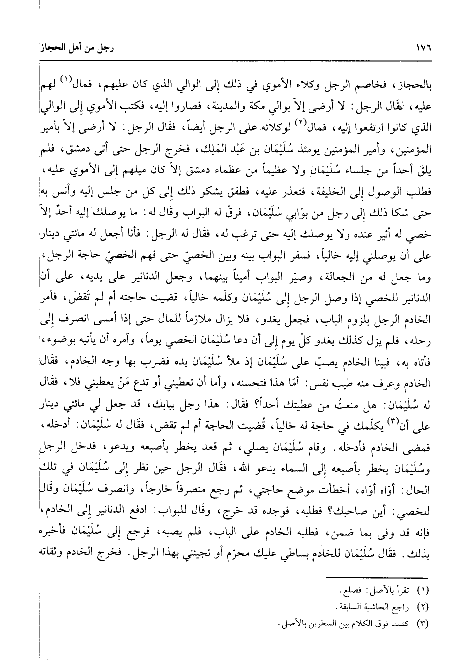 بالحجاز فخاصم الرجل وكلاء الأموي في ذلك إلى الوالي الذي كان عليهم فمال (1) لهم عليه فقال الرجل لا أرضى إلا بوالي مكة والمدينة فصاروا إليه فكتب الأموي إلى الوالي الذي كانوا ارتفعوا إليه فمال (2) لوكلائه على الرجل أيضا فقال الرجل لا أرضى إلا بأمير المؤمنين وأمير المؤمنين يومئذ سليمان بن عبد الملك فخرج الرجل حتى أتى دمشق فلم يلق أحدا من جلساء سليمان ولا عظيما من عظماء دمشق إلا كان ميلهم إلى الأموي عليه فطلب الوصول إلى الخليفة فتعذر عليه فطفق يشكو ذلك إلى كل من جلس إليه وأنس به حتى شكا ذلك إلى رجل من بوابي سليمان فرق له البواب وقال له ما يوصلك إليه أحد إلا خصى له أثير عنده ولايوصلك إليه حتى ترغب له فقال له الرجل فأنا أجعل له مائتي دينار على أن يوصلني إليه خاليا فسفر البواب بينه وبين الخصي حتى فهم الخصي حاجة الرجل وما جعل له من الجعالة وصير البواب أمينا بينهما وجعل الدنانير على يديه على أن الدنانير للخصي إذا وصل الرجل إلى سليمان وكلمه خاليا قضيت حاجته أم لم تقض فأمر الخادم الرجل بلزوم الباب فجعل يغدو فلا يزال ملازما للمال حتى إذا أمسى انصرف إلى رحله فلم يزل كذلك يغدو كل يوم إلى أن دعا سليمان الخصي يوما وأمره أن يأتيه بوضوء فأتاه به فبينا الخادم يصب على سليمان إذ ملأ سليمان يده فضرب بها وجه الخادم فقال الخادم وعرف منه طيب نفس أما هذا فتحسنه وأما أن تعطيني أو تدع من يعطيني فلا فقال له سليمان هل منعت من عطيتك أحدا فقال هذا رجل ببابك قد جعل لي مائتي دينار على أن (3) يكلمك في حاجة له خاليا قضيت الحاجة أم لم تقض فقال له سليمان أدخله فمضى الخادم فأدخله وقام سليمان يصلي ثم قعد يخطر بأصبعه ويدعو فدخل الرجل وسليمان يخطر بأصبعه إلى السماء يدعو الله فقال الرجل حين نظر إلى سليمان في تلك الحال أواه أواه أخطأت موضع حاجتي ثم رجع منصرفا خارجا وانصرف سليمان وقال للخصي أين صاحبك فطلبه فوجده قد خرج وقال للبواب ادفع الدنانير إلى الخادم فإنه قد وفى بما ضمن فطلبه الخادم على الباب فلم يصبه فرجع إلى سليمان فأخبره بذلك فقال سليمان للخادم بساطي عليك محرم أو تجيئني بهذا الرجل فخرج الخادم وثقاته