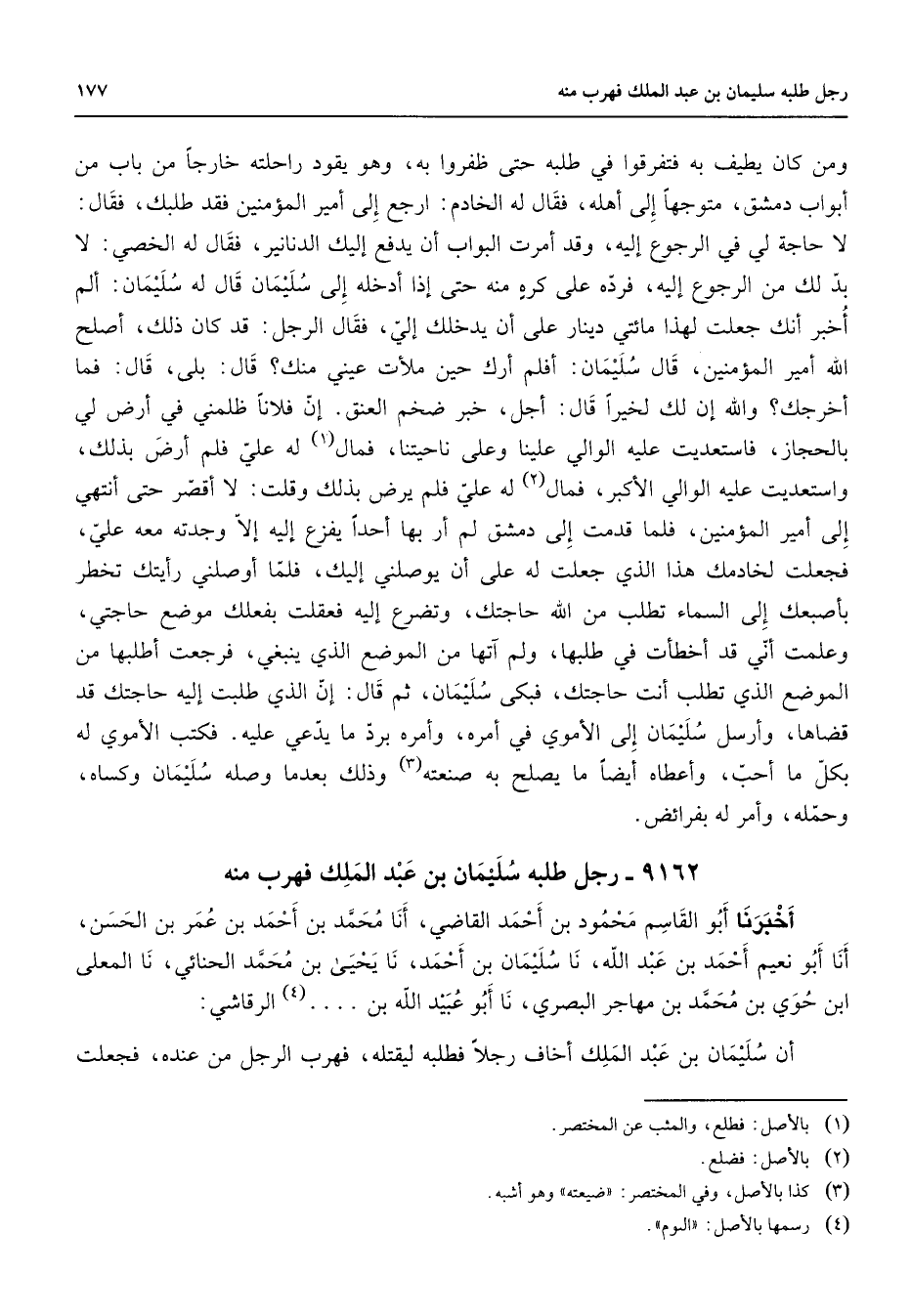 ومن كان يطيف به فتفرقوا في طلبه حتى ظفروا به وهو يقود راحلته خارجا من باب من أبواب دمشق متوجها إلى أهله فقال له الخادم ارجع إلى أمير المؤمنين فقد طلبك فقال لا حاجة لي في الرجوع إليه وقد أمرت البواب أن يدفع إليك الدنانير فقال له الخصي لا بد لك من الرجوع إليه فرده على كره منه حتى إذا أدخله إلى سليمان قال له سليمان ألم أخبر أنك جعلت لهذا مائتي دينار على أن يدخلك إلي فقال الرجل قد كان ذلك أصلح الله أمير المؤمنين قال سليمان أفلم أرك حين ملأت عيني منك قال بلى قال فما أخرجك والله إن لك لخيرا قال أجل خبر ضخم العنق إن فلانا ظلمني في أرض لي بالحجاز فاستعديت عليه الوالي علينا وعلى ناحيتنا فمال (1) له علي فلم أرض بذلك واستعديت عليه الوالي الأكبر فمال (2) له علي فلم يرض بذلك وقلت لا أقصر حتى أنتهي إلى أمير المؤمنين فلما قدمت إلى دمشق لم أر بها أحدا يفزع إليه إلا وجدته معه علي فجعلت لخادمك هذا الذي جعلت له على أن يوصلني إليك فلما أوصلني رأيتك تخطر بأصبعك إلى السماء تطلب من الله حاجتك وتضرع إليه فعقلت بفعلك موضع حاجتي وعلمت إني قد أخطأت في طلبها ولم آتها من الموضع الذي ينبغي فرجعت أطلبها من الموضع الذي تطلب أنت حاجتك فبكى سليمان ثم قال إن الذي طلبت إليه حاجتك قد قضاها وأرسل سليمان إلى الأموي في أمره وأمره برد ما يدعي عليه فكتب الأموي له بكل ما أحب وأعطاه أيضا ما يصلح به صنعته (3) وذلك بعدما وصله سليمان وكساه وحمله وأمر له بفرائض