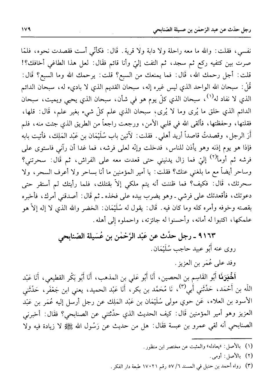 9163 - رجل حدث عن عبد الرحمن بن عسيلة الصنابحي روى عنه أبو عبيد حاجب سليمان وفد على عمر بن العزيز أخبرنا أبو القاسم بن الحصين أنا أبو علي بن المذهب أنا أبو بكر القطيعي أنا عبد الله بن أحمد حدثني أبي (3) نا محمد بن بكر أنا عبد الحميد يعني ابن جعفر حدثني الأسود بن العلاء عن حوي مولى سليمان بن عبد الملك عن رجل أرسلإليه عمر بن عبد العزيز وهو أمير المؤمنين قال كيف الحديث الذي حدثتني عن الصنابحي فقال أخبرني الصنابحي أنه لقي عمرو بن عبسة فقال هل من حديث عن رسول الله (صلى الله عليه وسلم) لا زيادة فيه ولا