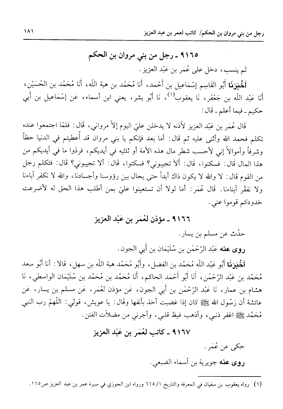 (1) رواه يعقوب بن سفيان في المعرفة والتاريخ 1 / 615 ورواه ابن الجوزي في سيرة عمر بن عبد العزيز ص 115