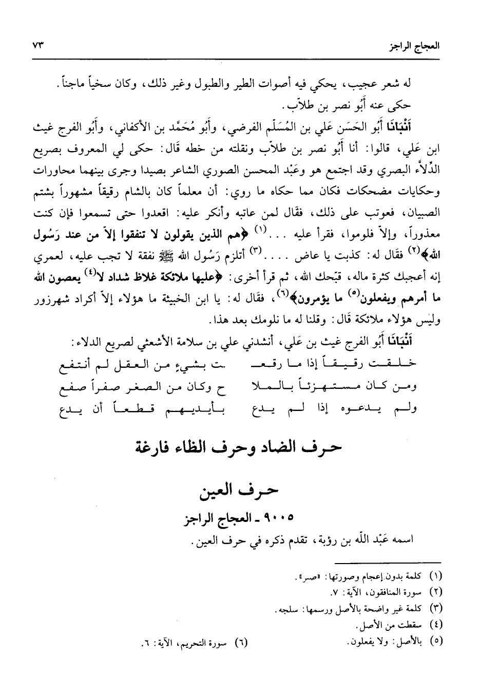(3) أتلزم رسول الله (صلى الله عليه وسلم) نفقة لا تجب عليه لعمري إنه أعجبك كثرة ماله قبحك الله ثم قرأ أخرى " عليها ملائكة غلاظ شداد لا (4) يعصون الله ما أمرهم ويفعلون (5) ما يأمرون " (6) فقال له يا ابن الخبيثة ما هؤلاء إلا أكراد شهرزور وليس هؤلاء ملائكة قال وقلنا له ما نلومك بعد هذا أنبأنا أبو الفرج غيث بن علي أنشدني علي بن سلامة الأشعثي لصريع الدلاء * خلقت رقيقا إذا ما رقع * ت بشئ من العقل لم أنتفع * ومن كان مستهزئا بالملا * ح وكان من الصغر صفرا صفع ولم يدعوه إذا لم يدع * بأيديهم قطعا أن يدع * " حرف الضاد حرف الظاء فارغة " " حرف العين "