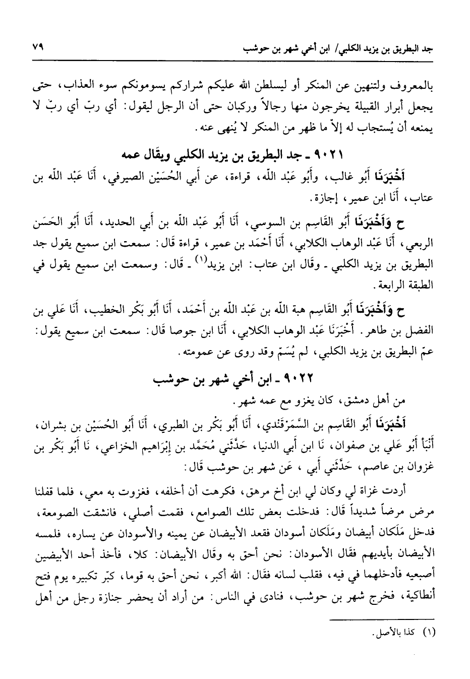 9021 - جد البطريق بن يزيد الكلبي ويقال عمه أخبرنا أبو غالب وأبو عبد الله قراءة عن أبي الحسين الصيرفي أنا عبد الله بن عتاب أنا ابن عمير إجازة ح وأخبرنا أبو القاسم بن السوسي أنا أبو عبد الله بن أبي الحديد أنا أبو الحسن الربعي أنا عبد الوهاب الكلابي أنا أحمد بن عمير قراءة قال سمعت ابن سميع يقول جد البطريق بن يزيد الكلبي وقال ابن عتاب ابن يزيد (1) قال وسمعت ابن سميع يقول في الطبقة الرابعة ح وأخبرنا أبو القاسم هبة الله بن عبد الله بن أحمد أنا أبو بكر الخطيب أنا علي بن الفضل بن طاهر أخبرنا عبد الوهاب الكلابي أنا ابن جوصا قال سمعت ابن سميع يقول عم البطريق بن يزيد الكلبي لم يسم وقد روى عن عمومته