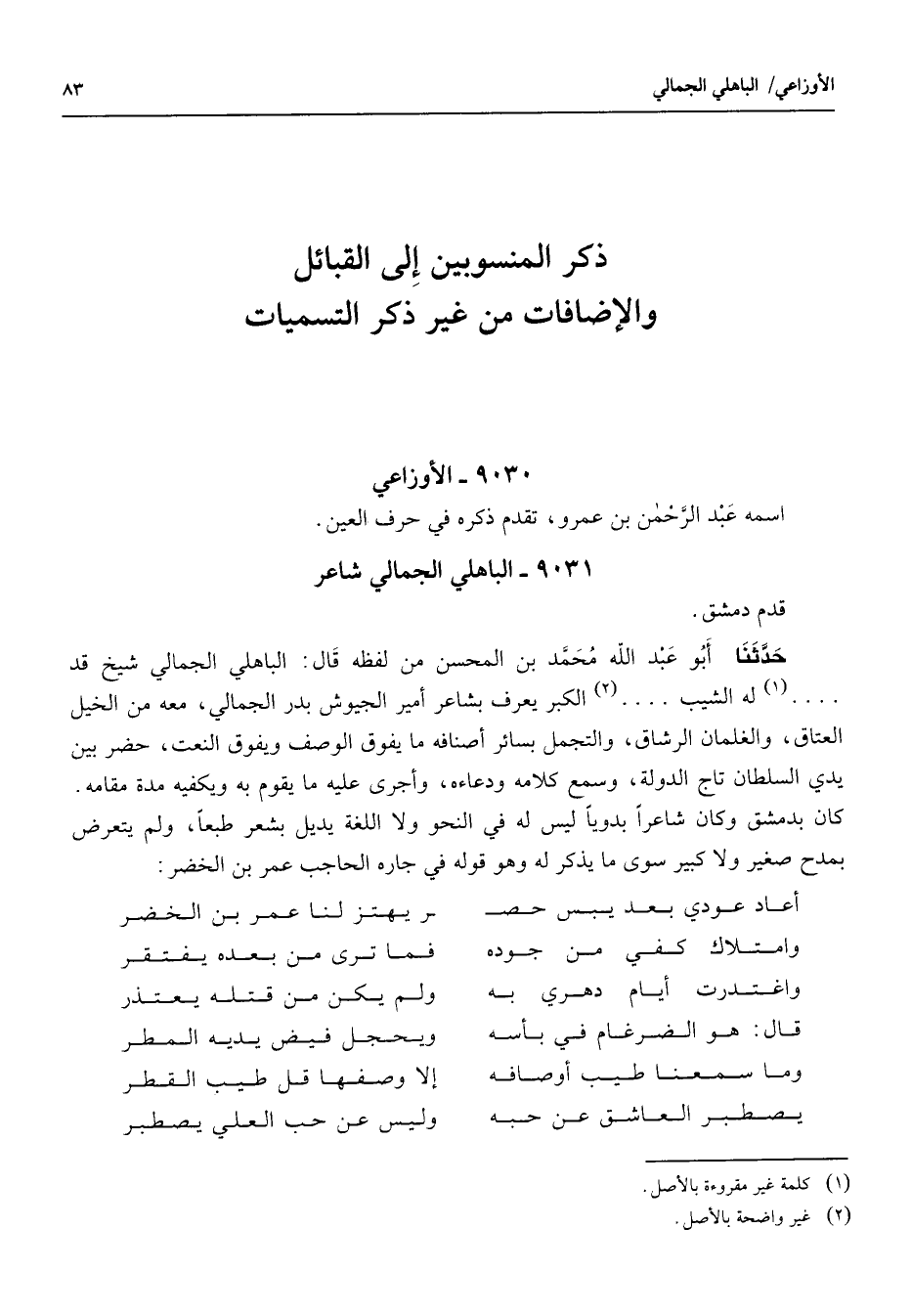 9031 - الباهلي الجمالي شاعر قدم دمشق حدثنا أبو عبد الله محمد بن المحسن من لفظه قال الباهلي الجمالي شيخ قد