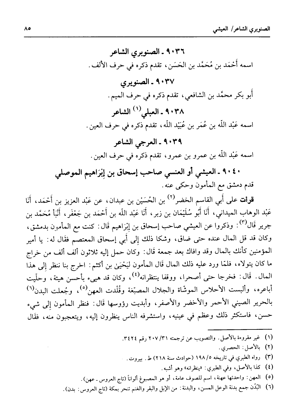 9040 - العيشي أو العنسي صاحب إسحاق بن إبراهيم الموصلي قدم دمشق مع المأمون وحكى عنه قرأت على أبي القاسم الخضر (2) بن الحسين بن عبدان عن عبد العزيز بن أحمد أنا عبد الوهاب الميداني أنا أبو سليمان بن زبر أنا عبد الله بن أحمد بن جعفر أنبأ محمد بن جرير قال (3) وذكروا عن العيشي صاحب إسحاق بن إبراهيم قال كنت مع المأمون بدمشق وكان قد قل المال عنده حتى ضاق وشكا ذلك إلى أبي إسحاق المعتصم فقال له يا أمير المؤمنين كأنك بالمال وقد وافاك بعد جمعة قال وكان حمل إليه ثلاثون ألف ألف من خراج ما كان يتولاه فلما ورد عليه ذلك المال قال المأمون ليحيى بن أكثم اخرج بنا ننظر إلى هذا المال قال فخرجا حتى أصحرا ووقفا ينتظرانه (4) وكان قد هيئ باحسن هيئة وحليت أباعره وألبست الأحلاس الموشاة والجلال المصبغة وقلدت العهن (5) وجعلت البدن (6) بالحرير الصيني الأحمر والأخضر والأصفر وأبديت رؤوسها قال فنظر المأمون إلى شئ حسن فاستكثر ذلك وعظم في عينيه واستشرفه الناس ينظرون إليه ويتعجبون منه فقال