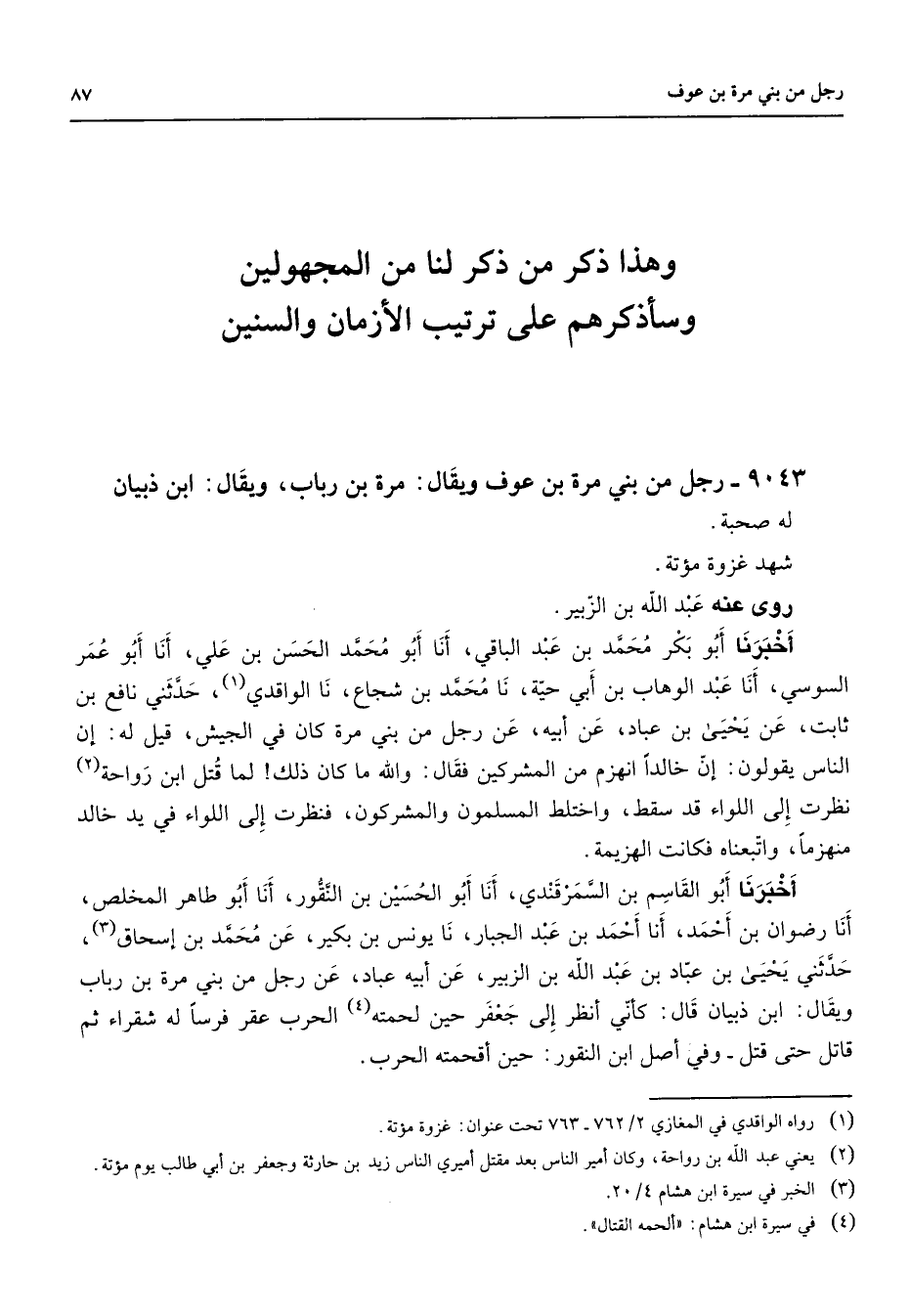 9043 - رجل من بني مرة بن عوف ويقال مرة بن رباب ويقال ابن ذبيان له صحبة شهد غزوة مؤتة روى عنه عبد الله بن الزبير أخبرنا أبو بكر محمد بن عبد الباقي أنا أبو محمد الحسن بن علي أنا أبو عمر السوسي أنا عبد الوهاب بن أبي حية نا محمد بن شجاع نا الواقدي (1) حدثني نافع بن ثابت عن يحيى بن عباد عن أبيه عن رجل من بني مرة كان في الجيش قيل له إن الناس يقولون إن خالدا انهزم من المشركين فقال والله ما كان ذلك لما قتل ابن رواحة (2) نظرت إلى اللواء قد سقط واختلط المسلمون والمشركون فنظرت إلى اللواء في يد خالد منهزما واتبعناه فكانت الهزيمة أخبرنا أبو القاسم بن السمرقندي أنا أبو الحسين بن النقور أنا أبو طاهر المخلص أنا رضوان بن أحمد أنا أحمد بن عبد الجبار نا يونس بن بكير عن محمد بن إسحاق (3) حدثني يحيى بن عباد بن عبد الله بن الزبير عن أبيه عباد عن رجل من بني مرة بن رباب ويقال ابن ذبيان قال كأني أنظر إلى جعفر حين لحمته (4) الحرب عقر فرسا له شقراء ثم قاتل حتى قتل وفي أصل ابن النقور حين أقحمته الحرب