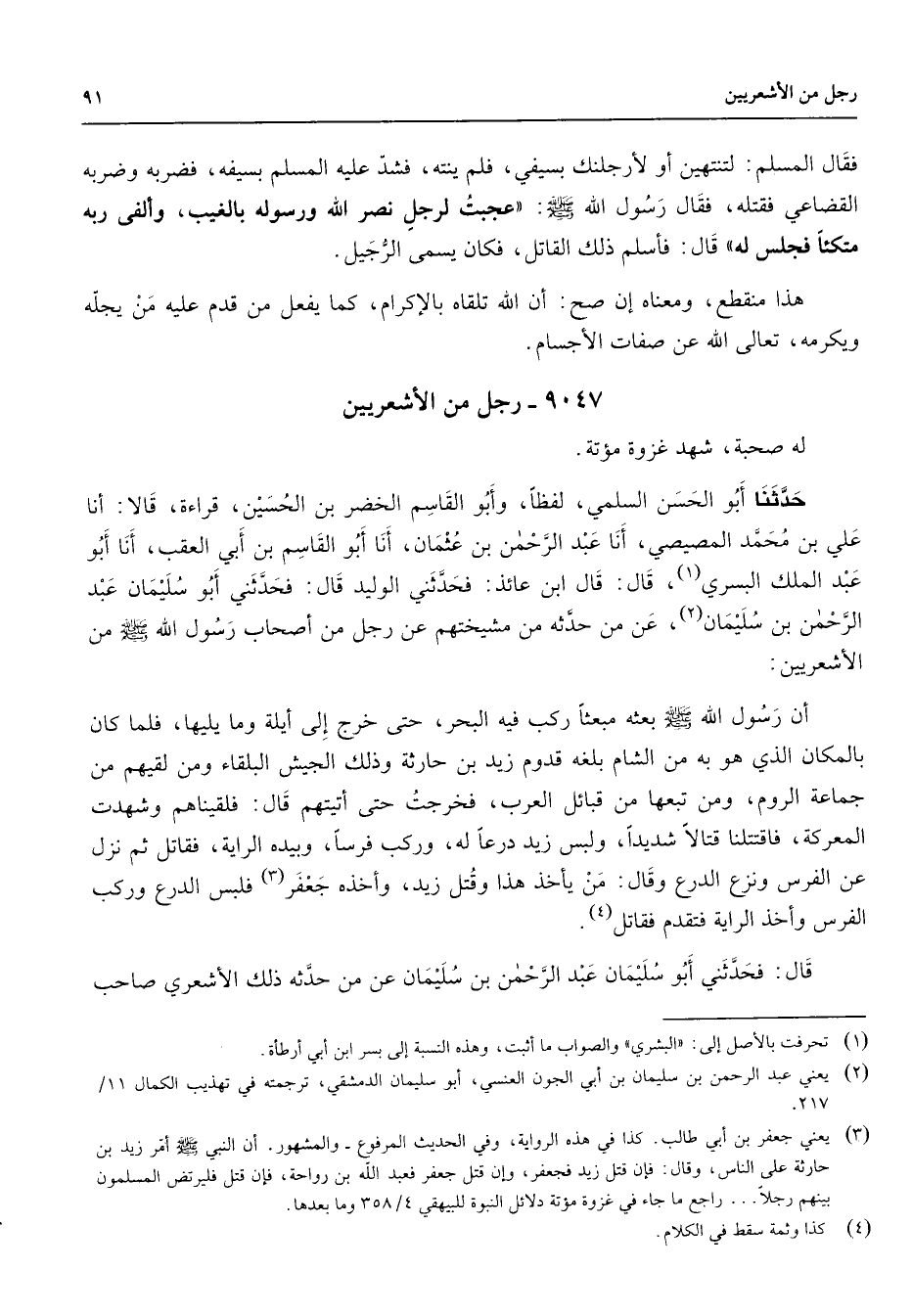 9047 - رجل من الأشعريين له صحبة شهد غزوة مؤتة حدثنا أبو الحسن السلمي لفظا وأبو القاسم الخضر بن الحسين قراءة قالا أنا علي بن محمد المصيصي أنا عبد الرحمن بن عثمان أنا أبو القاسم بن أبي العقب أنا أبو عبد الملك البسري (1) قال قال ابن عائذ فحدثني الوليد قال فحدثني أبو سليمان عبد الرحمن بن سليمان (2) عن من حدثه من مشيختهم عن رجل من أصحاب رسول الله (صلى الله عليه وسلم) من الأشعريين أن رسول الله (صلى الله عليه وسلم) بعثه مبعثا ركب فيه البحر حتى خرج إلى أيلة وما يليها فلما كان بالمكان الذي هو به من الشام بلغه قدوم زيد بن حارثة وذلك الجيش البلقاء ومن لقيهم من جماعة الروم ومن تبعها من قبائل العرب فخرجت حتى أتيتهم قال فلقيناهم وشهدت المعركة فاقتتلنا قتالا شديدا ولبس زيد درعا له وركب فرسا وبيده الراية فقاتل ثم نزل عن الفرس ونزع الدرع وقال من يأخذ هذا وقتل زيد وأخذه جعفر (3) فلبس الدرع وركب الفرس وأخذ الراية فتقدم فقاتل (4) قال فحدثني أبو سليمان عبد الرحمن بن سليمان عن من حدثه ذلك الأشعري صاحب