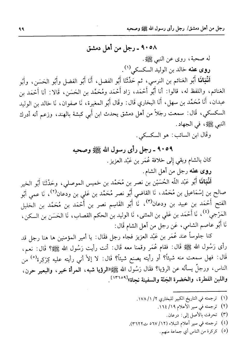 9058 - رجل من أهل دمشق له صحبة روى عن النبي (صلى الله عليه وسلم) روى عنه خالد بن الوليد السكسكي (1) أنبأنا أبو الغنائم بن النرسي ثم حدثنا أبو الفضل أنا أبو الفضل وأبو الحسن وأبو الغنائم واللفظ له قالوا أنا أبو أحمد زاد أحمد ومحمد بن الحسن قالا أنا أحمد بن عبدان أنا محمد بن سهل أنا البخاري قال وقال أبو المغيرة نا صفوان نا خالد بن الوليد السكسكي قال سمعت رجلا من أهل دمشق يحدث ابن أبي كبشة بالهند وزعم أنه أدرك النبي (صلى الله عليه وسلم) في الجهاد وقال ابن السائب هو السكسكي 9059 رجل رأى رسول الله (صلى الله عليه وسلم) وصحبه كان بالشام وبقي إلى خلافة عمر بن عبد العزيز روى عنه رجل من أهل الشام أنبأنا أبو عبد الله الحسين بن نصر بن محمد بن خميس الموصلي وحدثنا أبو الخير صالح بن إسماعيل بن محمد نا القاضي أبو نصر محمد بن علي بن ودعان (2) نا عمي أبو الفتح أحمد بن عبيد بن ودعان (3) نا أبو القاسم نصر بنأحمد بن محمد بن الخليل المرجي (4) نا أحمد بن علي بن المثنى نا الوليد بن الحكم القصاب نا الحسن بن السكن نا أبو عاصم الشامي عن رجل من أهل الشام قال كنا جلوسا عند عمر بن عبد العزيز فجاء رجل فقال يا أمير المؤمنين ها هنا رجل قد رأى رسول الله (صلى الله عليه وسلم) قال فقام عمر وقمنا معه قال أنت رأيت رسول الله (صلى الله عليه وسلم) قال نعم قال فهل سمعت منه شيئا أو رأيته يصنع شيئا قال لا إلا إني رأيته عليه كركرة (5) من الناس ورجل يسأله عن الرؤيا فقال رسول الله (صلى الله عليه وسلم) الرؤيا شبه المرأة خير والبعير حرن واللبن الفطرة والخضرة الجنة والسفينة نجاة