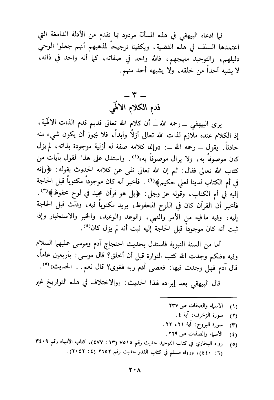 وإذا اتضح لنا إثبات البيهقي - رحمه الله - لهذه الصفات ودليله لذلك الإثبات من النقل والعقل، فقد وضح أيضاً أنه يلتزم في ذلك الإثبات مبدأ طالما التزمه السلف، وجعلوه أساساً للإثبات، وهو إثباتها له سبحانه على وجه يليق بجلاله وعظمته، لا يشبه أحداً من خلقه، ولا يشبهه أحد منهم.