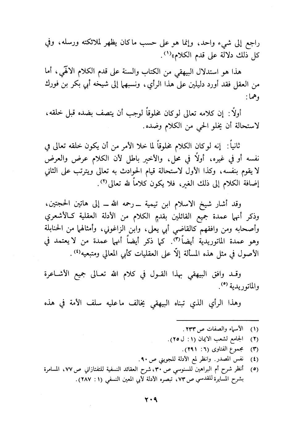 فهذا دليل عقلي ساقه البيهقي - رحمه الله - ليسند به رأيه في إثبات هذه الصفات على ضوء قوله تعالى: {لَيْسَ كَمِثْلِهِ شَيْءٌ وَهُوَ السَّمِيعُ الْبَصِيرُ} فقد جمع سبحانه في هذه الآية بين إثبات الصفات، وبين تنزيهه سبحانه عن مشابهة المخلوقات، فصفاته سبحانه تليق بجلاله وكماله، وصفات خلقه تليق بضعفهم وافتقارهم.