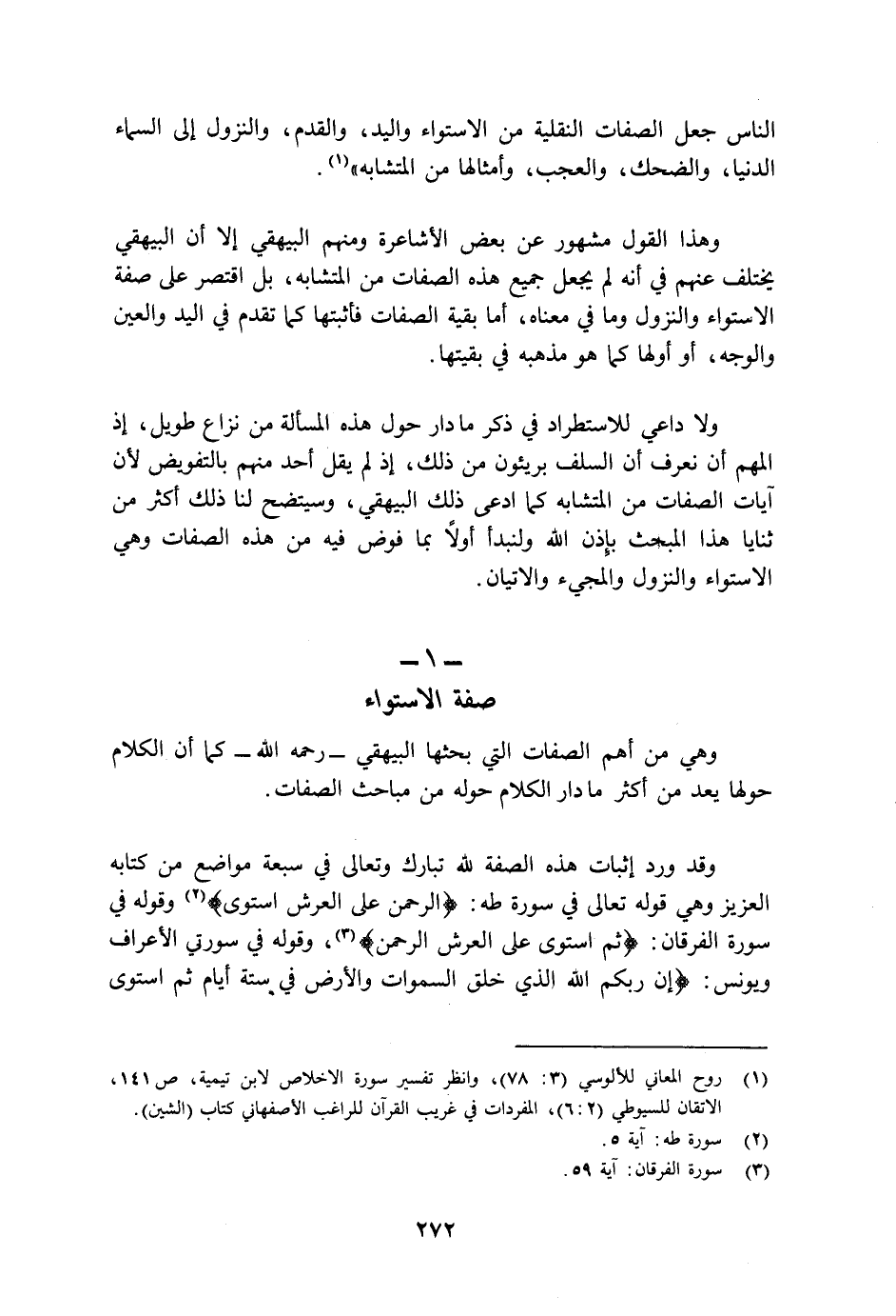 بين البيهقي وأصحابه من جانب وبين السلف من جانب آخر ينحصر - هنا - في حقيقة الكلام ما هو؟ وإلا فالكل يقول إن القرآن الحقيقي غير مخلوق، وإنما قال الأشاعرة بخلق القرآن المنزل على محمّد صلى الله عليه وسلم، لأنهم يقولون إنه ليس هو القرآن الحقيقي، وإنما هو عبارة عنه ودلالات عليه، أما القرآن الحقيقي فهو نفسي قديم وهو غير مخلوق، وهذا رأي واضح البطلان - كما تقدم عند الكلام على المبحث الخاص بحقيقة الكلام.