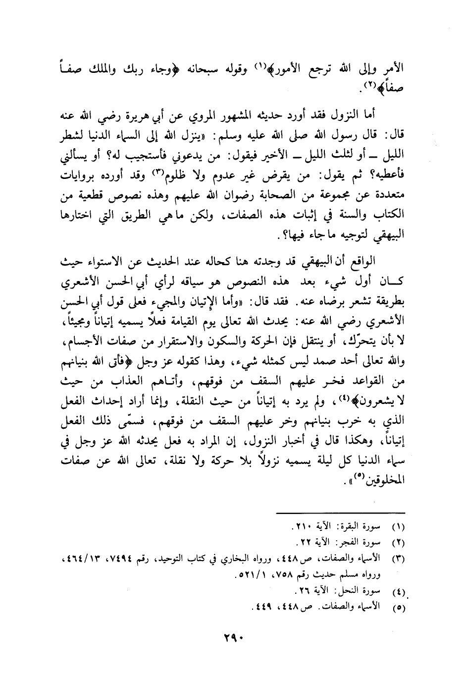 وإنما أشار - رحمه الله - بذلك إلى أن هذه الآية ليست من آيات الصفات، لذلك ينبغي تفسيرها على أحد الرأيين السالفين، وهو تفسير لم يبتدعه البيهقي، بل رواه عن إمامين جليلين من أئمة السلف.