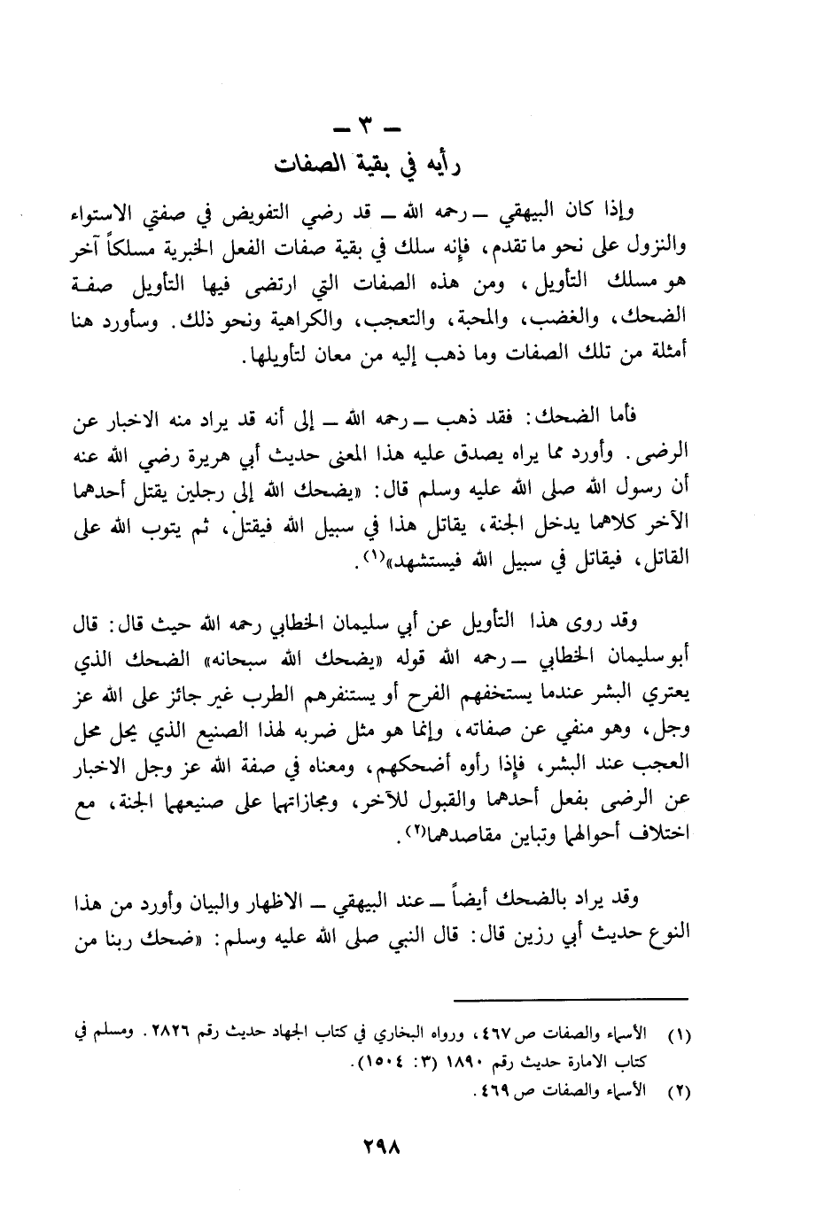 ويؤيد ما ذهب إليه البيهقي ماورد في رواية البخاري من إشارته صلى الله عليه وسلم إلى عينه عند بيانه الصفة التي نعرف بها ربّنا سبحانه وهو كماله في صفاته، ونقصان الدجال بإصابته بالعور في عينه اليمنى. وهذا إثبات صريح لصفة العين، ورد ملجم لكل مؤول.