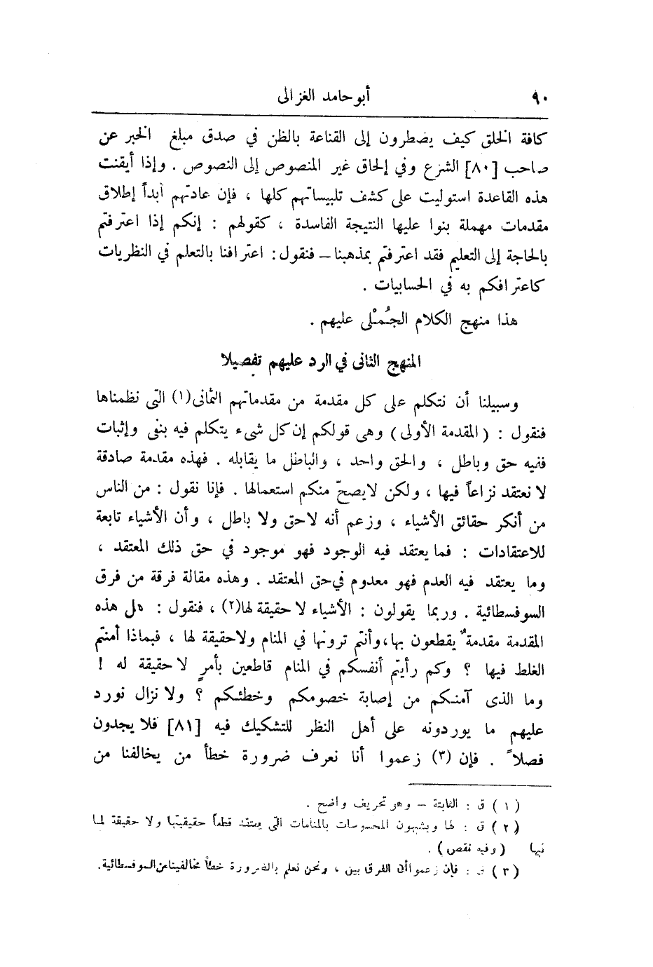 فِي الضروريات فَمَا بَال عقل السوفسطائية كذب وَمَا الْفرق بَين عقلكم وعقلهم أفتقولون ان ذَلِك مِنْهُم حَمَاقَة وَسُوء مزاج قُلْنَا وَكَذَلِكَ حالكم فِي انكار النظريات وَهُوَ كمن يُنكر الحسابيات من الْعُلُوم فانه لَا يشككنا فِي الْبَرَاهِين الحسابية وان كَانَ البليد لَا يفهم ومنكر النّظر اصلا يجحده وَلَكِن طريقنا مَعَه أَن نورد عَلَيْهِ الْمُقدمَات وَهِي ضَرُورِيَّة فَإِذا أدْركهَا اِدَّرَكَ النتيجة فَكَذَلِك خصمنا إِذا كذبنَا فِي مَسْأَلَة من الْمسَائِل كإنكار ثُبُوت وَاجِب الْوُجُود عرضنَا عَلَيْهِ مُقَدمَات الْقيَاس الدَّالَّة عَلَيْهِ وَقُلْنَا أتماري فِي قَوْلنَا لَا شكّ فِي أصل الْوُجُود اَوْ فِي قَوْلنَا ان كل مَوْجُود إِمَّا جَائِز واما وَاجِب ام فِي قَوْلنَا ان كَانَ وَاجِبا فقد ثَبت وَاجِب الْوُجُود ام فِي قَوْلنَا إِن كَانَ جَائِزا فَكل جَائِز مُسْتَند الى وَاجِب الْوُجُود فِي آخر الْأَمر لَا محَالة وَإِذا لم يُمكنهُ التشكك فِي الْمُقدمَات لم يُمكنهُ التشكك فِي النتيجة وانما يخْتَلف النَّاس فِيهَا لَان الْفطْرَة غير كَافِيَة فِي تَعْرِيف التَّرْتِيب لهَذِهِ الْمُقدمَات بل لَا بُد من تعلمهَا من الافاضل وَذَلِكَ الْفَاضِل لَا بُد ان يكون تعلم أَكْثَرهَا اَوْ إستأثر باستنباط بَعْضهَا وَهَكَذَا حَتَّى يَنْتَهِي الامر الى معلم مَعْصُوم هُوَ نَبِي موحى ايه من جِهَة الله تَعَالَى هَكَذَا تكون الْعُلُوم كلهَا فان زَعَمُوا أَنكُمْ اعترفتم بِالْحَاجةِ الى الْمعلم وَمن لم يعْتَرف فَهُوَ معاند للمشاهدة فالافتقار اليه معترف بِهِ وَلكنه كالافتقار اليه فِي علم الْحساب فانه لَا يحْتَاج فِيهِ الى مَعْصُوم اذ لَا تَقْلِيد فِيهِ وَلَكِن يحْتَاج الى حاسب يُنَبه على طَرِيق النّظر فَإِذا تننبه الْمعلم سَاوَى الْمعلم فِي الْعلم الضَّرُورِيّ الْمُسْتَفَاد من الْمُقدمَات بَعْضهَا على بعض وَلَا شكّ فِي أَن معلم الْحساب أَيْضا يعلم أَكثر مِمَّا يعلم وان اسْتَقل باستنباط تَرْتِيب الْبَعْض وَكَذَا القَوْل فِي معلم الْمعلم الى ان يَنْتَهِي مبدأ الْعلم الحسابي الى نَبِي من الانبياء مؤيد بِالْوَحْي والمعجزة وَلَكِن بعد إفَاضَة الله علم الْحساب فِيمَا بَين الْخلق اسْتغنى فِي تعلمه عَن معلم مَعْصُوم فَكَذَلِك الْعُلُوم الْعَقْلِيَّة النظرية وَلَا فرق