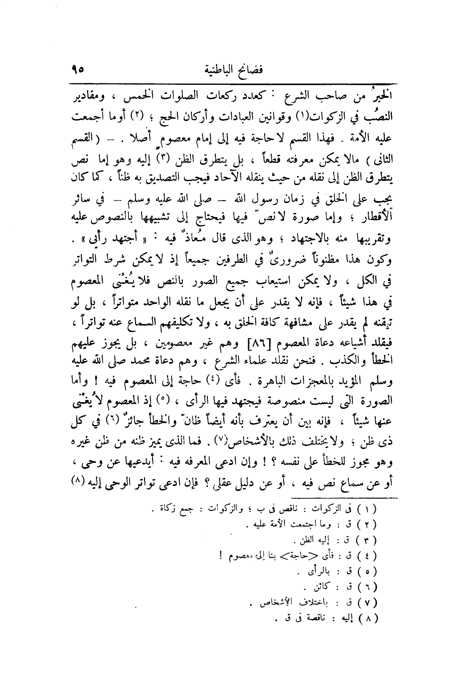 الْقسم الثَّالِث الالفاظ الَّتِي لَيست مجملة وَلَا صَرِيحَة وَلكنهَا ظَاهِرَة فانها تثير ظنا ويكتفى بِالظَّنِّ فِي ذَلِك الْقَبِيل والفن وَسَوَاء كَانَ ذَلِك فِي الفقهيات وَأُمُور الْآخِرَة أَو صِفَات الله فَلَيْسَ يجب على الْخلق إِلَّا أَن يعتقدوا التَّوْحِيد والألفاظ فِيهِ صَرِيحَة وَأَن يعتقدوا أَنه قَادر عليم سميع بَصِير لَيْسَ كمثله شَيْء وكل ذَلِك اشْتَمَل الْقُرْآن عَلَيْهِ وَهُوَ مُصَرح بِهِ أما النّظر فِي كَيْفيَّة هَذِه الصِّفَات وحقيقتها وَأَنَّهَا تَسَاوِي قدرتنا وَعلمنَا وبصرنا أم لَا فَقَوله لَيْسَ كمثله شَيْء دَال على نفي الْمُمَاثلَة لسَائِر الموجودات وَهَذَا قد اكْتفى من الْخلق بِهِ فَلَا حَاجَة بهم إِلَى مَعْصُوم نعم النَّاظر فِيهِ والمستدل عَلَيْهِ بالأدلة الْعَقْلِيَّة قد يتَوَصَّل إِلَى الْيَقِين فِي بعض مَا ينظر فِيهِ وَإِلَى الظَّن فِي بعضه وَيخْتَلف ذَلِك باخْتلَاف الذكاء والفطنة وَاخْتِلَاف الْعَوَائِق والبواعث ومساعدة التَّوْفِيق فِي النّظر والعارف يَذُوق الْيَقِين وَإِذا تَيَقّن لم يتمار فِيهِ وَلم يشككه قُصُور غَيره عَن الدَّرك وَرُبمَا تضعف نَفسه ويشككه خلاف غَيره ز كل ذَلِك لَا مضرَّة لَهُ لِأَنَّهُ لَيْسَ مَأْمُورا بِهِ والمعصوم لَا يغنى عَنهُ شَيْئا لَو تَابعه فَإِن مَحْض التَّقْلِيد لَا يَكْفِيهِ وَإِن ذكر وَجه الدَّلِيل فَذَلِك لَا يخْتَلف صدوره عَن مَعْصُوم أَو غَيره كَمَا سبق وَأما الدّلَالَة الثَّانِيَة وَهِي قو لَهُم إِذا جَاءَكُم مسترشد متحير وسألكم عَن الْعُلُوم الدِّينِيَّة أفتحيلونه على عقله ليستقل بِالنّظرِ وَهُوَ عَاجز