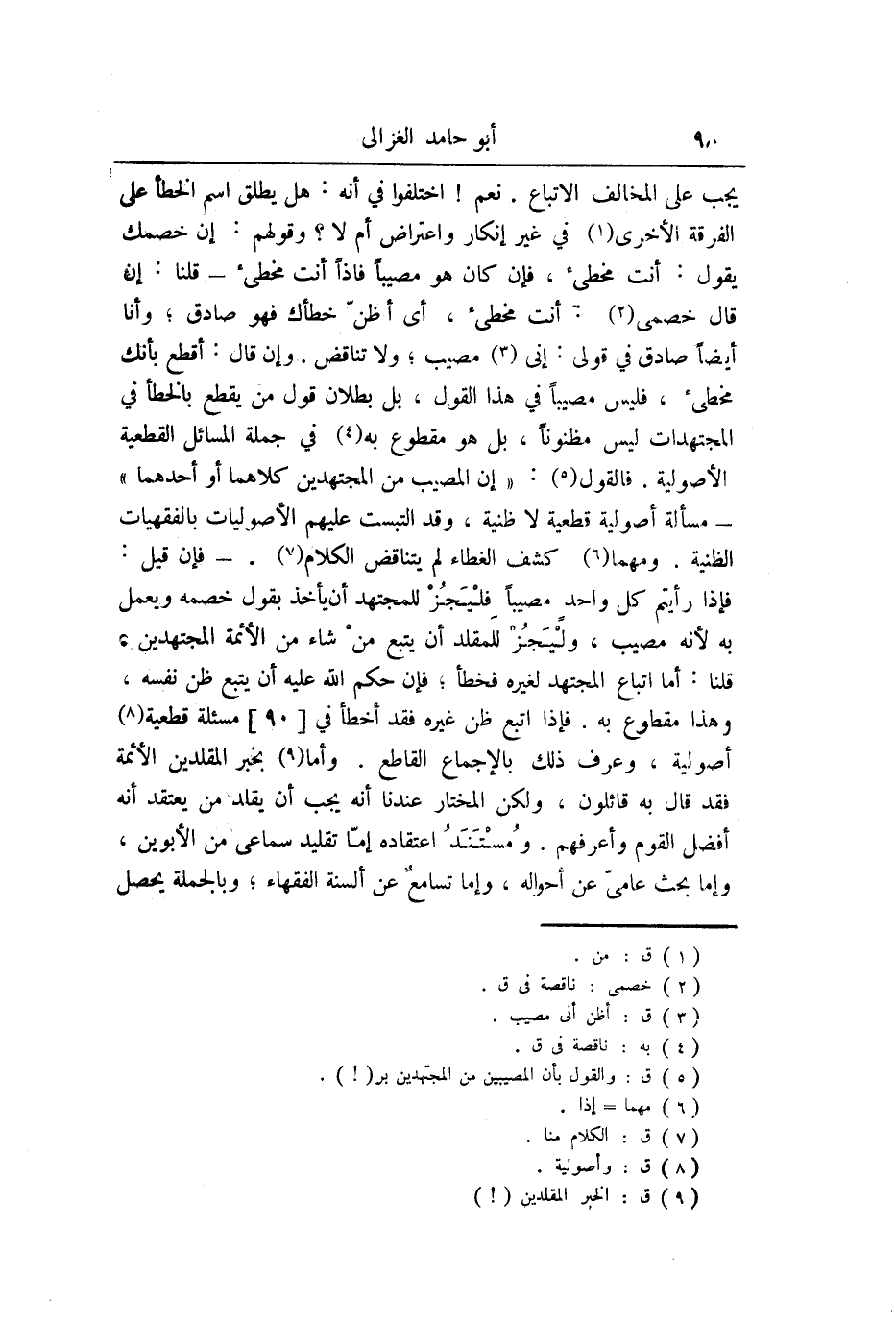 الَّذِي هُوَ فِي آخر كتاب إقليدس فَلم يفهمهُ لبلادته بل فِي الشكل الأول الَّذِي مضمونه إِقَامَة الْبَرَاهِين على مثلث متساوي الأضلاع فَلم يُدْرِكهُ عرفنَا ان مزاجه لَيْسَ يحْتَمل هَذَا الْعلم الدَّقِيق فَلَيْسَ كل خلقه يحْتَمل الْعُلُوم بل الصناعات والحرف فَهَذَا لَا يدل على فَسَاد هَذَا الأَصْل فَإِن قَالَ المسترشد لست أَشك فِي هَذِه الْمُقدمَات وَلَا فِي النتيجة وَلَكِن لم يخالفكم من يخالفكم قُلْنَا لجهله تَرْتِيب هَذِه الْمُقدمَات اَوْ لعناده أولبلادته وينكشف الغطاء بِأَن نشافه وَاحِدًا مِنْهُم يمِيل إِلَى الْإِنْصَاف ونراجعه فِي هَذِه الْمُقدمَات حَتَّى يتَبَيَّن لَك أَنه بَين أَن يفهم ويصف ويعترف اَوْ لَا يفهم لبلادته أَو يمنعهُ التعصب والتقليد عَن حسن الإصغاء إِلَيْهِ فَلَا يُدْرِكهُ وَعند ذَلِك يطلع على خطئه وَكَذَلِكَ يصنع بِهِ فِي كل مَسْأَلَة وَينظر فِيهِ إِلَى مَا تحتمله حَاله ويقبله ذكاؤه وفطنته وَلَا يحملهُ مَالا يطيقه بل رُبمَا يقنعه بِمَا يُورث لَهُ إعتقادا فِي الْحق مصمما فَإِن أَكثر عوام الْخلق قنع مِنْهُم الشَّرْع بذلك وَلَا يكْشف لَهُ عَن وَجه الْبَرَاهِين فَرُبمَا لَا يفهمها