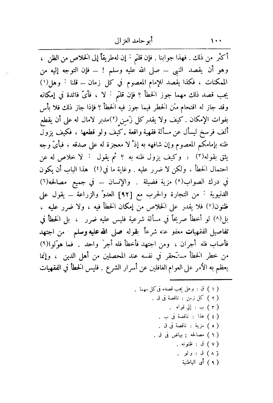 الْجَواب الثَّالِث عَن قَوْلهم إِن الْكَثْرَة أَمارَة الْبَاطِل فمذهبنا وَاحِد لَا كَثْرَة فِيهِ وانما الْكَثْرَة فِي الاشخاص الَّذين اجْتَمعُوا على مَسْأَلَة ثمَّ افْتَرَقُوا فِي مسَائِل فَلم قابلوا هَذَا بِكَثْرَة فِي جَوَاب الْمَسْأَلَة وَهُوَ فِي قَوْلنَا كم الْخَمْسَة والخمسة بل ورأيه فِي الْمَذْهَب أَن يُفْتِي فِي مَسْأَلَة وَاحِدَة بفتاوي كَثِيرَة متناقضة فَعِنْدَ ذَلِك يُقَال الْكَثْرَة دَلِيل الْبَاطِل ولسنا نفتي فِي كل مَسْأَلَة الا بِوَاحِد فَإنَّا نقُول الله وَاحِد وَمُحَمّد صلى الله عَلَيْهِ وَسلم رَسُوله وَهُوَ صَادِق ومؤيد بالمعجزة فَهَذِهِ فَتْوَى وَاحِدَة فلتكن حَقًا وان كَانَ بَاطِلا فَهُوَ مُوَافق لمذهبهم وَقَوْلنَا ان نظر الْعقل طَرِيق يُوصل الى دَرك مَا لَا يدْرك اضطرارا مَذْهَب وَاحِد لَا كَثْرَة فِيهِ فَلْيَكُن حَقًا كَمَا أَن قَوْلنَا الْعُلُوم الحسابية عُلُوم صَادِقَة قَول وَاحِد وَكَانَ حَقًا وليتعجب من ابعادهم فِي التلبيس إِذْ أخذُوا لَفْظَة الْكَثْرَة وَهِي لَفْظَة