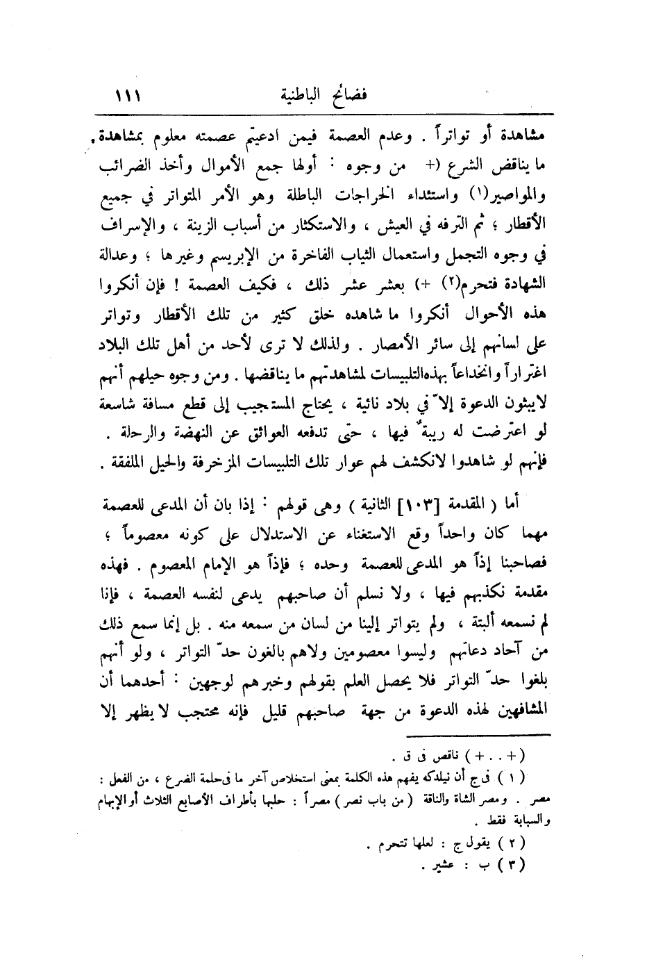 وَهَذَا الْقدر يكفيهم قُلْنَا نعم يكفيهم هَذَا الْقدر إِن كَانَ كل مَا يخْطر بالبال ويوافق شَهْوَة الضلال يُمكن اختراعه وَنَقله متواترا وَلَكِن هَذَا على