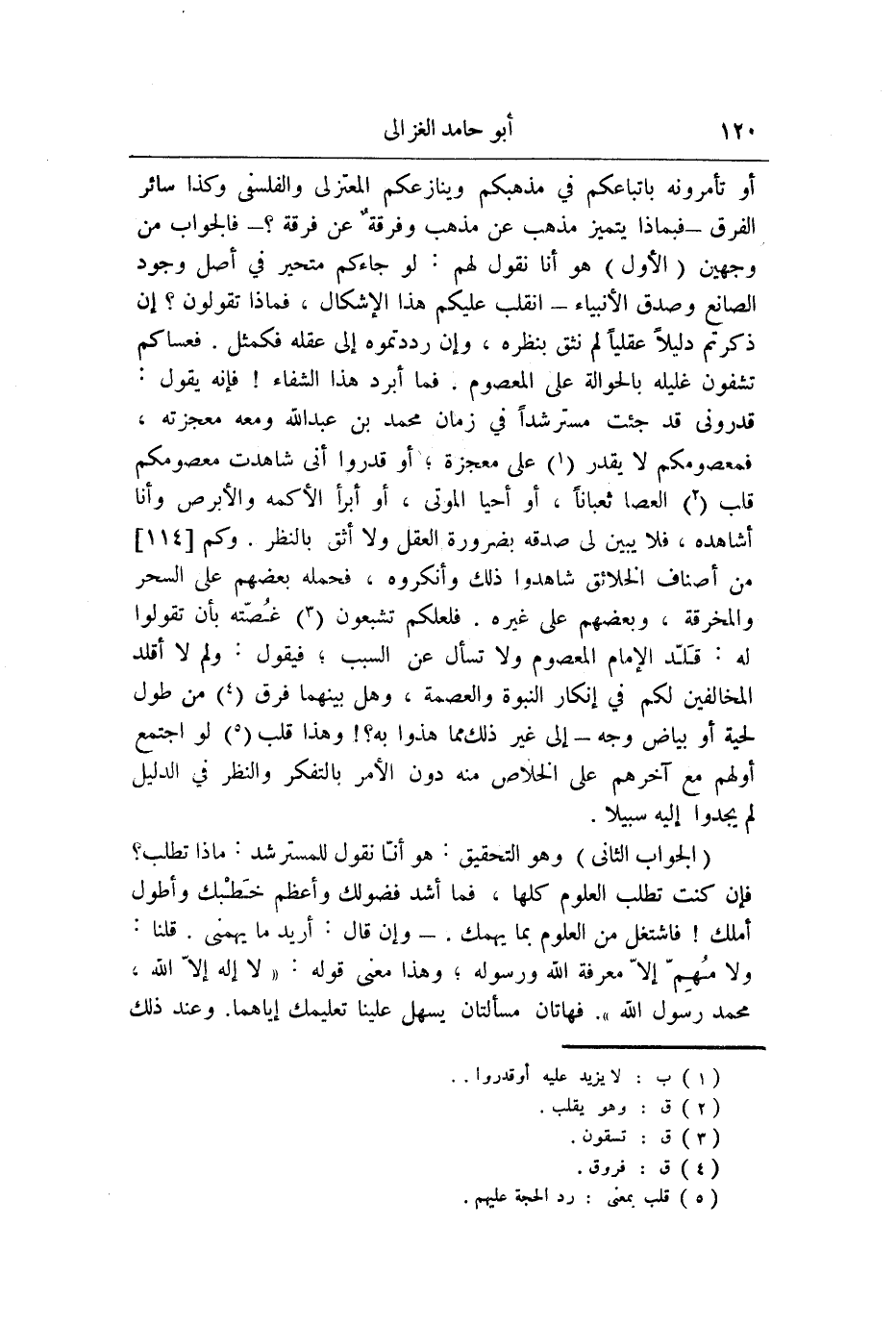 على أَنه لَا بُد أَن يكون مَعْصُوما فَيَقُولُونَ انما نحتاج اليه لدفع الْخُصُومَات وَجمع شتات الْأُمُور وَجزم القَوْل فِي المجتهدات وَإِقَامَة حُدُود الله تَعَالَى وَاسْتِيفَاء حُقُوقه وصرفها الى مستحقيها إِذْ لَا سَبِيل الى تعطيلها وَلَا سَبِيل إِلَى تفويضها الى كَافَّة الْخلق فيتزاحمون عَلَيْهَا متقاتلين ويتكاسلون عَنْهَا متواكلين ومتخاذلين فتعطل الْأُمُور فجملة الدُّنْيَا فِي حق الإِمَام كبلدة وَاحِدَة فِي حق القَاضِي فَكَمَا يسْتَغْنى عَن عصمَة القَاضِي فِي الْبَلَد وَيحْتَاج الى قَضَائِهِ فَكَذَلِك يسْتَغْنى عَن عصمَة الامام وَيحْتَاج إِلَيْهِ كَمَا يحْتَاج الى الْقُضَاة ولأمور أخر كُلية سياسية من حراسة الْإِسْلَام والذب عَن بيضته والنضال دون حوزته وحشد العساكر والجنود الى اهل الطغيان والعناد وتطهير وَجه الأَرْض عَن الطغاة والبغاة والساعين فِي الأَرْض بِالْفَسَادِ وملاحظة أَطْرَاف الْبِلَاد بِالْعينِ الكالئة حَتَّى إِذا ثارت فتْنَة بَادر إِلَى الْأَمر بتطفئتها وَإِذا نبغت نَابِغَة تقدم عى الْفَوْر بإزالتها قبل أَن تسحكم غائلتها وتستطير فِي الأَرْض نائرتها هَذَا وَمَا يجْرِي مجْرَاه هُوَ الَّذِي يُرَاد لاجله الإِمَام وَذَلِكَ يحْتَاج الى عَدَالَة وَعلم ونجدة وكفاية وصرامة وشرائط آخر سنذكرها فِي الْبَاب التَّاسِع
