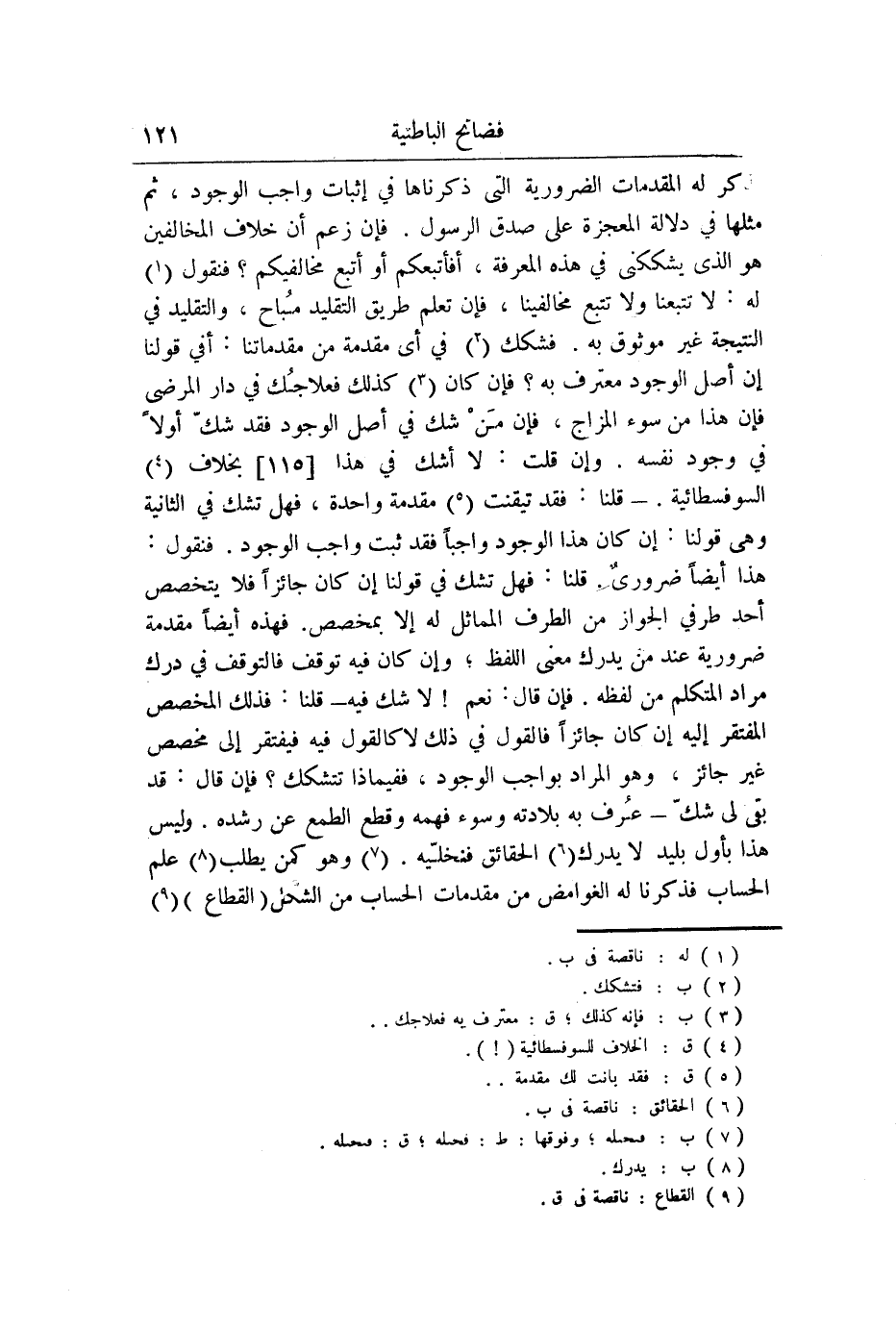 فَأَما الْعِصْمَة فيستغنى عَنْهَا كَمَا فِي حق الْقُضَاة والولاة فَإِن منعُوا وإدعوا الْعِصْمَة للقضاة والولاة وكل مترشح لإمر من الْأُمُور من جِهَة الإِمَام وَهَذَا مَا اعتقده الإمامية حَتَّى اورد عَلَيْهِم الحارس والمتعسس والبواب ويرتبط بِكُل وَاحِد مِنْهُم امْر فَأَجَابُوا بِأَن هَذِه الْأُمُور إِنَّا كَانَت امورا دينية شرطت الْعِصْمَة فِي المتكفلين بهَا والمنتصب لَهَا بِنصب الامام لَا يكون إِلَّا مَعْصُوما ونعوذ بِاللَّه من اعْتِقَاد مَذْهَب يضْطَر ناصره والذاب عَنهُ إِلَى ان يجاحد مَا يُشَاهِدهُ ويدركه على البديهة والضرورة فالظلم على طَبَقَات النَّاس مشَاهد من أَحْوَال المتصبين من جِهَة إمَامهمْ وَلَا يَنْفَكّ أورع متدين مِنْهُم عَن استحلال الْأَمْوَال الْمَغْصُوبَة باسم الْخراج والضريبة من اموال الْمُسلمين الْعلم بِتَحْرِيمِهِ وَمهما انْتهى كَلَام الْخصم الى مجاحدة الضَّرُورَة فَلَا وَجه الا الْكَفّ عَنهُ والاقتصار على تعزيته فِيمَا اصيب بِهِ من عقله