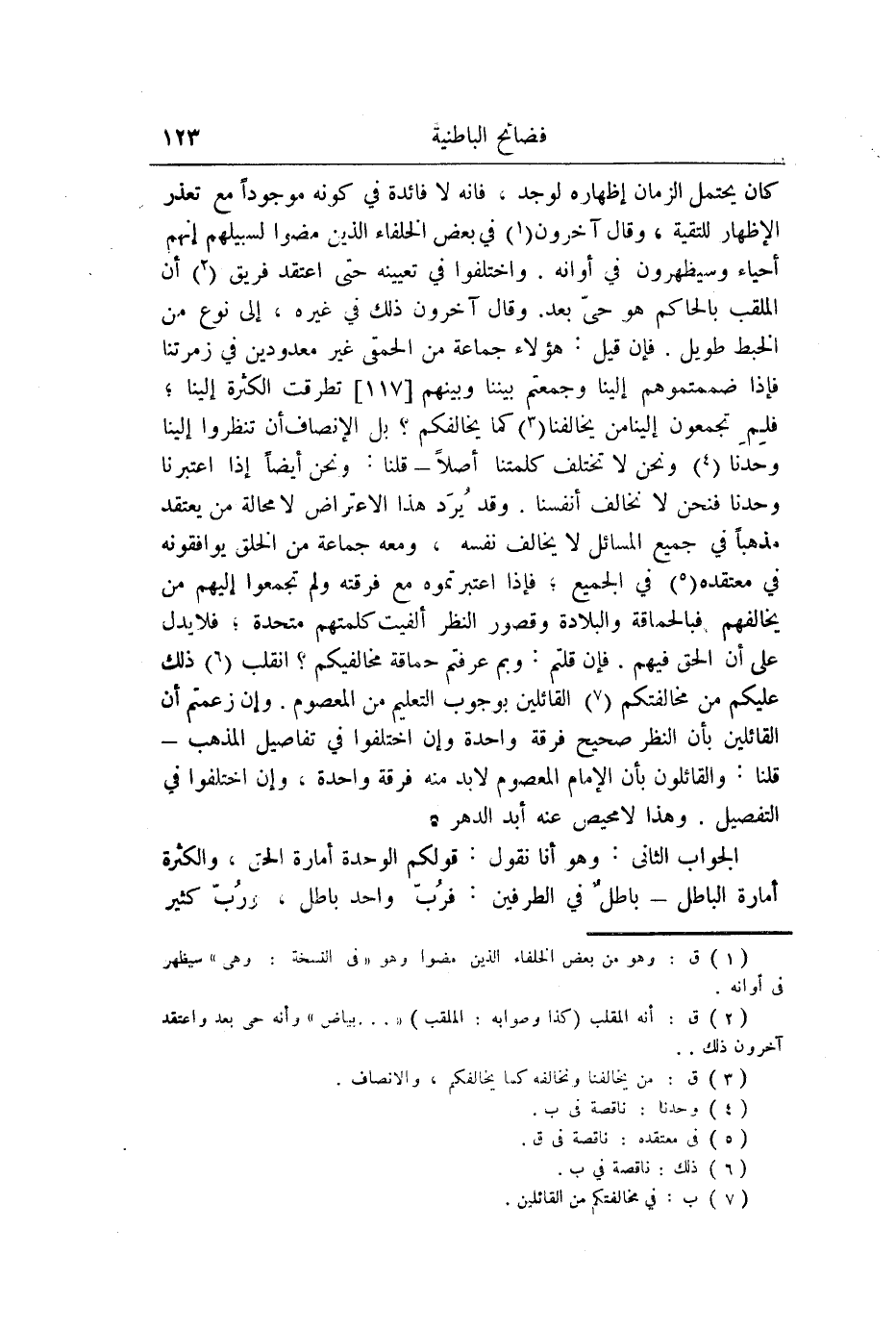 وَلَا يعْتَقد كفرنا وَلكنه يعْتَقد فِينَا أَنا أهل البغى زلت بصائرنا عَن دَرك الْحق خطأ إِذْ عدلنا عَن اتِّبَاعه عنادا ونكدا فَهَذَا الشَّخْص لَا يستباح سفك دَمه وَلَا يحكم بِكُفْرِهِ لهَذِهِ الاقاويل بل يحكم بِكَوْنِهِ ضَالًّا مبتدعا فيزجر عَن ضلاله وبدعته بِمَا يَقْتَضِيهِ رَأْي الإِمَام فَأَما أَن يحكم بِكُفْرِهِ ويستباح دَمه بِهَذِهِ المقالات فَلَا وَهَذَا انما يقْتَصر على تضليله وتبديعه إِذْ لم يعْتَقد شَيْئا مِمَّا حكينا من مَذْهَبهم فِي الالهيات وَفِي امور الْحَشْر والنشر وَلكنه لم يعْتَقد فِي جَمِيع ذَلِك إِلَّا مَا نعتقده وانما تميز عَنَّا بالقدرالذي حكيناه الْآن فَأن قيل هلا كفر تموهم بقَوْلهمْ أَن مُسْتَحقّ الْإِمَامَة فِي الصَّدْر الاول كَانَ عليا دون أبي بكر وَعمر وَمن بعده وَأَنه دفع بِالْبَاطِلِ وَفِي ذَلِك خرق الْإِجْمَاع أهل الدّين قُلْنَا لَا ننكر مَا فِيهِ من القحوم على خرق الْإِجْمَاع وَلذَلِك ترقينا من التخطئة الْمُجَرَّدَة (الَّتِي نطلقها ونقتصر عَلَيْهَا فِي الْفُرُوع فِي بعض الْمسَائِل) إِلَى التضليل والتفسيق والتبديع وَلَكِن لَا تَنْتَهِي إِلَى