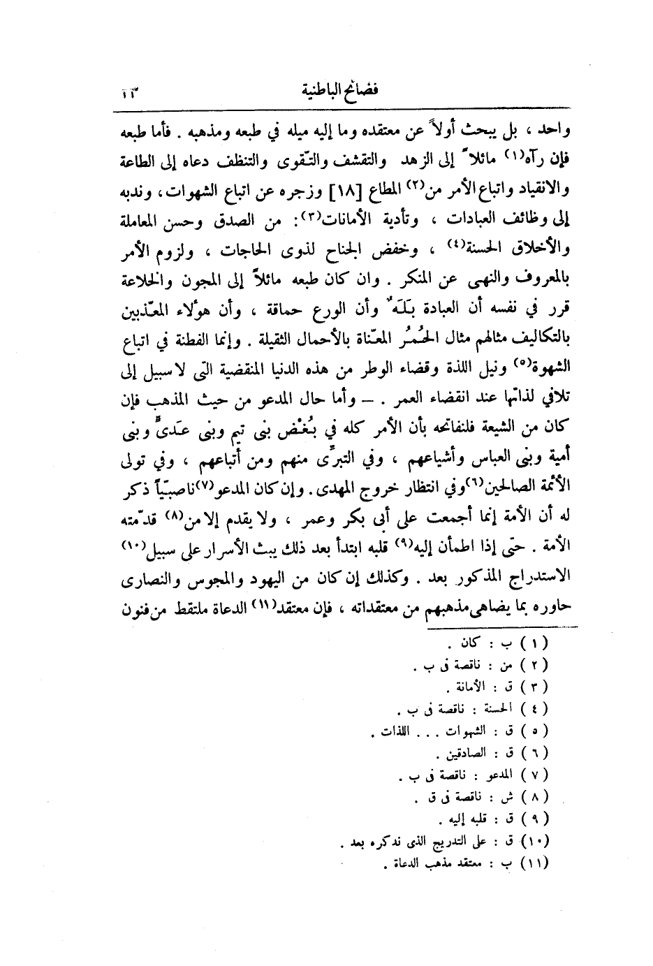 على بواطن هَذِه الظَّوَاهِر انْحَلَّت عَنْهُم هَذِه الْقُيُود وانحطت عَنْهُم هَذِه التكاليف العملية فان الْمَقْصُود من أَعمال الجوارج تَنْبِيه الْقلب لينهض الطِّبّ الْعلم فَإِذا ناله استعد للسعادة القصوى فَيسْقط عَنهُ تَكْلِيف الْجَوَارِح وانما تَكْلِيف الْجَوَارِح فِي حق من يجْرِي بجهله مجْرى الْحمر الَّتِي لَا يُمكن رياضتها إِلَّا بِالْأَعْمَالِ الشاقة وَأما الأذكياء والمدركون للحقائق فدرجتهم ارْفَعْ من ذَلِك وَهَذَا فن من الإغواء شَدِيد على الأذكياء وغرضهم هدم قوانين الشَّرْع وَلَكِن يخادعون كل ضَعِيف بطرِيق يغويه ويليق بِهِ وَهَذَا من الإضلال الْبَارِد وَهُوَ فِي حكم ضرب الْمِثَال كَقَوْل الْقَائِل إِن الاحتماء عَن الاطعمه الْمضرَّة انما يجب على من فسد مزاجه فَأَما من اكْتسب اعْتِدَال المزاح فليواظب على أكل مَا شَاءَ أَي وَقت شَاءَ فَلَا يلبث المصغي الي هَذَا الضلال ان يمعن فِي المطعومات الْمضرَّة إِلَيّ أَن تتداعى بِهِ الى الْهَلَاك