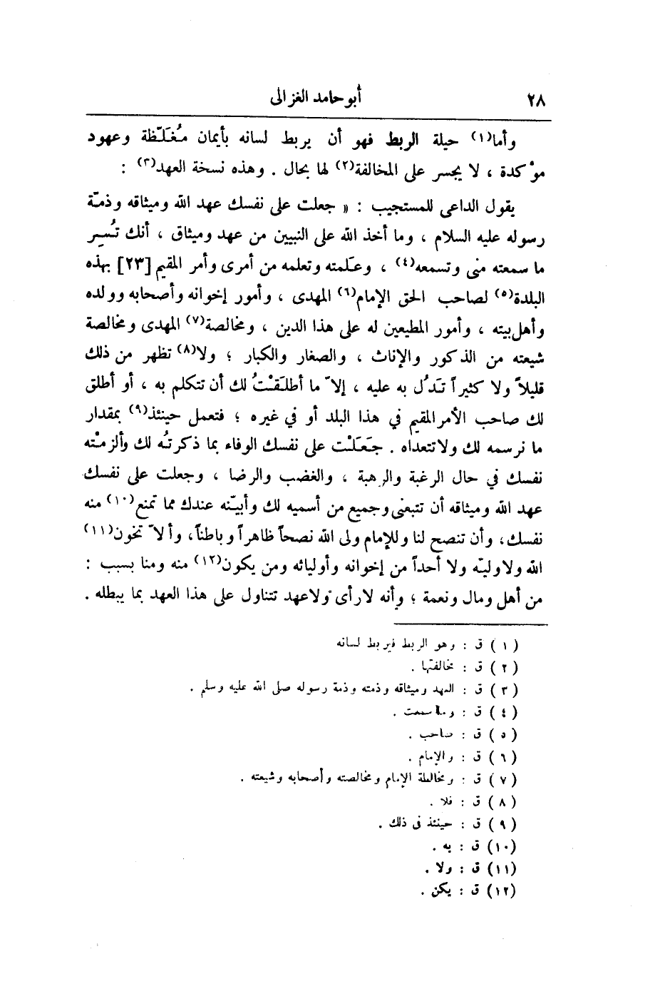 وَالْقُرْآن من اوله الى اخره دَال على جَوَاز ذَلِك ووقوعه فَهَل لَك من مَانع سوى ان عصمته علمت بمعجزته وعصمة من يَدعِيهِ علمت بهذيانك وشهوتك فان قَالَ ان مَا فِي الْقُرْآن ظواهر هِيَ رموز إِلَى بواطن لم يفهموها وَقد فهمها الإِمَام الْمَعْصُوم فتعلمنا مِنْهُ قُلْنَا تعلمتم مِنْهُ بمشاهدة ذَلِك فِي قلبه بِالْعينِ اَوْ سَمَاعا من لَفظه وَلَا يُمكن دَعْوَى الْمُشَاهدَة وَلَا بُد من الِاسْتِنَاد الى سَماع لَفظه قُلْنَا وَمَا يُؤمنك أَن لَفظه لَهُ بَاطِن لم تطلع عَلَيْهِ فَلَا تثق بِمَا فهمته من ظَاهر لَفظه فَإِن زعمت أَنه صرح مَعَك وَقَالَ مَا ذكرته هُوَ ظَاهر لَا رمز فيهوالمراد ظَاهره قُلْنَا وَبِمَ عرفت أَن قَوْله هَذَا وَهُوَ أَنه ظَاهر لَا رمز فِيهِ أَيْضا ظَاهر وَفِيه رمز الى مَا لم تطلع عَلَيْهِ فلايزال يُصَرح بِلَفْظِهِ وَنحن نقُول لسنا مِمَّن يغتر بالظواهر فَلَعَلَّ تَحْتَهُ رمزا وان انكر الْبَاطِن فَنَقُول تَحت انكاره رمز وان حلف بِالطَّلَاق الثَّلَاث على انه مَا قصد الا الظَّاهِر فَنَقُول فِي طَلَاقه رمز وانما هُوَ مظهر شَيْئا ومضمر غَيره فان قلت فَذَلِك يُؤَدِّي الى حسم بَاب التفهيم قُلْنَا فَأنْتم حسمتم بَاب التفهيم على الرَّسُول فان ثُلثي الْقُرْآن فِي وصف الْجنَّة وَالنَّار والحشر والنشر مُؤَكد بالقسم والايمان وانتم تَقولُونَ لَعَلَّ تَحت ذَلِك رمزا وانتم تَقولُونَ وَأي فرق بَين ان يطول فِي تفهم الْأُمُور التَّطْوِيل الَّذِي عرف فِي الْقُرْآن وَالْأَخْبَار وَبَين أَن تَقول مَا أُرِيد إِلَّا الظَّاهِر فَإِن جَازَ عَلَيْهِ ان يفهم الظَّاهِر وَيكون مُرَاده غير مَا علم قطعا انه مَا وصل الى افهام الْخلق وَيكون كَاذِبًا فِي جَمِيع مَا قَالَ لاجل مصلحَة وسر فِيهِ جَازَ انيكون امامكم الْمَعْصُوم بزعمكم يضمر مَعكُمْ خلاف مَا يظهره وضد مَا يفهمهُ ونقيض مَا يتَيَقَّن انه الْوَاصِل الى افهامكم ويؤكد ذَلِك بالايمان الْمُغَلَّظَة لمصْلحَة لَهُ وسر فِيهِ وَهَذَا لَا جَوَاب عَنهُ أَبَد الدَّهْر وَعند هَذَا يَنْبَغِي أَن يعرف الانسان ان رُتْبَة هَذِه الْفرْقَة أخس من رُتْبَة كل فرقة من فرق الضلال