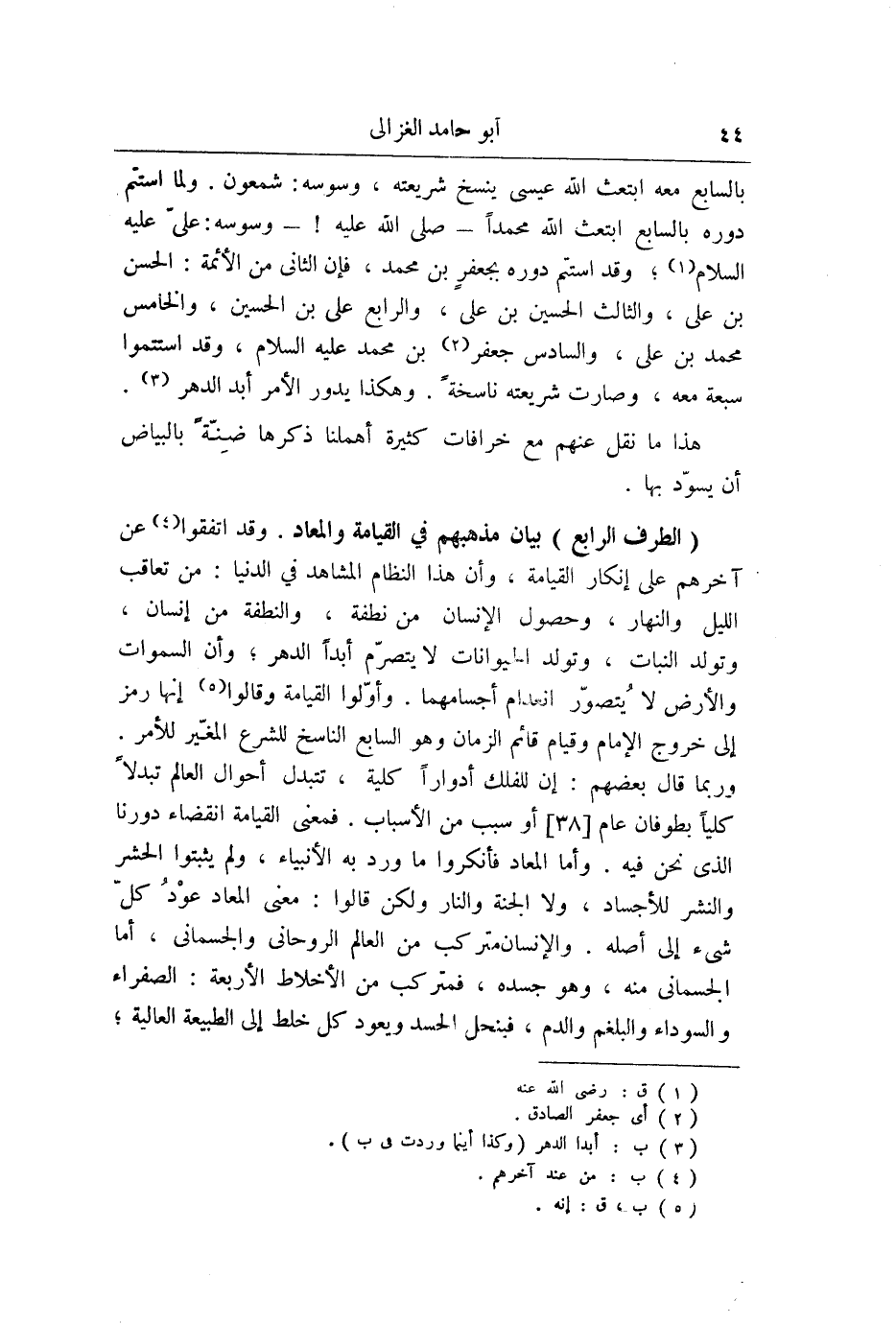 وَزَعَمُوا أَن حُدُودهَا معرفَة اسرار حروفها وَهِي ان لَا إِلَه الا الله ارْبَعْ كَلِمَات وَسَبْعَة فُصُول وَهِي قطع لَا إِلَه الا الله وَثَلَاثَة جَوَاهِر // فَإِن لَا حرف يبْقى إِلَه وَإِلَّا الله فَهِيَ ثَلَاثَة جَوَاهِر // وَالْجُمْلَة اثْنَا عشر حرفا وَزَعَمُوا ان الْكَلِمَات الاربع دَالَّة على المدبرين العلوين السَّابِق والتالي والمدبرين السفليين النَّاطِق والاساس هَذِه دلَالَته على الروحانيات فَأَما على الجسمانيات فانها الطبائع الاربع واما الْجَوَاهِر الثَّلَاثَة فدالة على جِبْرِيل وَمِيكَائِيل وإسرافيل من الروحانيات وَمن الجسمانيات على الطول وَالْعرض والعمق إِذْ بهَا ترى الاجسام والفصول السَّبْعَة تدل من الروحانيات على الانبياء السَّبْعَة وَمن الجسمانيات على الْكَوَاكِب السَّبْعَة لِأَنَّهُ لَو الْأَنْبِيَاء السَّبْعَة لما اخْتلفت الشَّرَائِع كَمَا أَنه لَوْلَا الْكَوَاكِب السَّبْعَة لما اخْتلفت الْأَزْمِنَة والحروف الاثنا عشر تدل على الْحجَج الاثنى عشر (// وَفِي الجسمانيات على البروج الاثنى عشر //) وَهَكَذَا تصرفوا فِي قَول مُحَمَّد رَسُول الله وَفِي الْحُرُوف وَفِي اوائل السُّور وأبرزوا ضروبا من الحماقات تضحك المجانين فضلا عَن الْعُقَلَاء وناهيك خزيا بطَائفَة هَذَا مَنْهَج استدلالهم ولسنا نكثر حِكَايَة هَذَا الْجِنْس عَنْهُم اكْتِفَاء بِهَذَا الْقدر فِي تَعْرِيف مخازيهم وَهَذَا فن يعرف بضرورة الْعقل