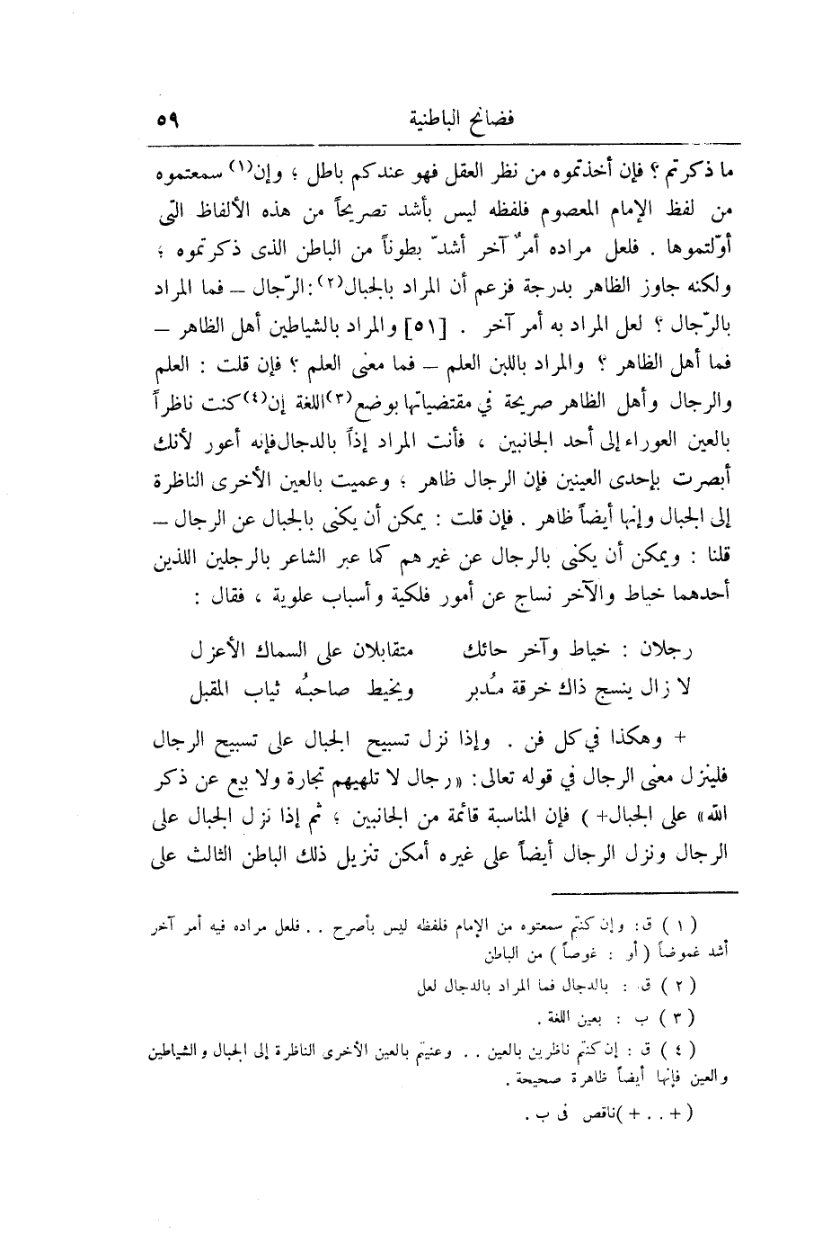 فَإِن قيل الْعُلُوم الحسابيه معترف بهَا لانها ضَرُورِيَّة وَلذَلِك لم يخْتَلف فِيهَا واما النظريات الْعَقْلِيَّة فان كَانَت مقدماتها كَذَلِك فَلم وَقع الِاخْتِلَاف فِيهَا فوقوع الِاخْتِلَاف فِيهَا يقطع الامان قُلْنَا هَذَا بَاطِل من وَجْهَيْن (أَحدهمَا) أَن الْعُلُوم الحسابيه اخْتلف فِيهَا تَفْصِيلًا وَجُمْلَة من وَجْهَيْن أَحدهمَا ان الْأَوَائِل قد اخْتلفُوا فِي كثير من هيئات الْفلك وَمَعْرِفَة مقاديرها وَهِي مثبتة على مُقَدمَات حسابيه