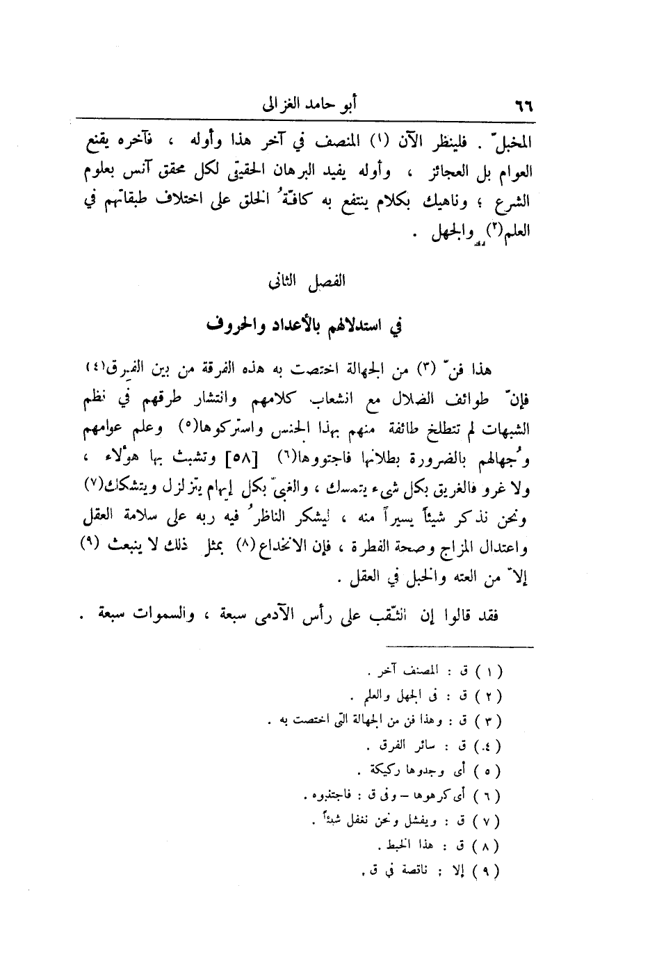 وان كَافَّة الْخلق كَيفَ يضطرون الى القناعة بِالظَّنِّ فِي صدق مبلغ الْخَبَر عَن صَاحب الشَّرْع وَفِي الحاق غير الْمَنْصُوص الى النُّصُوص واذا ايقنت هَذِه الْقَاعِدَة استوليت على كشف تلبيساتهم كلهَا فان عَادَتهم ابدا اطلاق مُقَدمَات مُهْملَة بنوا عَلَيْهَا النتيجة الْفَاسِدَة كَقَوْلِهِم انكم اذا اعترفتم بِالْحَاجةِ الى التَّعْلِيم فقد اعترفتم بمذهبنا فَنَقُول اعترافنا بالتعلم فِي النظريات كاعترافكم بِهِ فِي الحسابيات هَذَا مَنْهَج الْكَلَام الْجملِي عيلهم