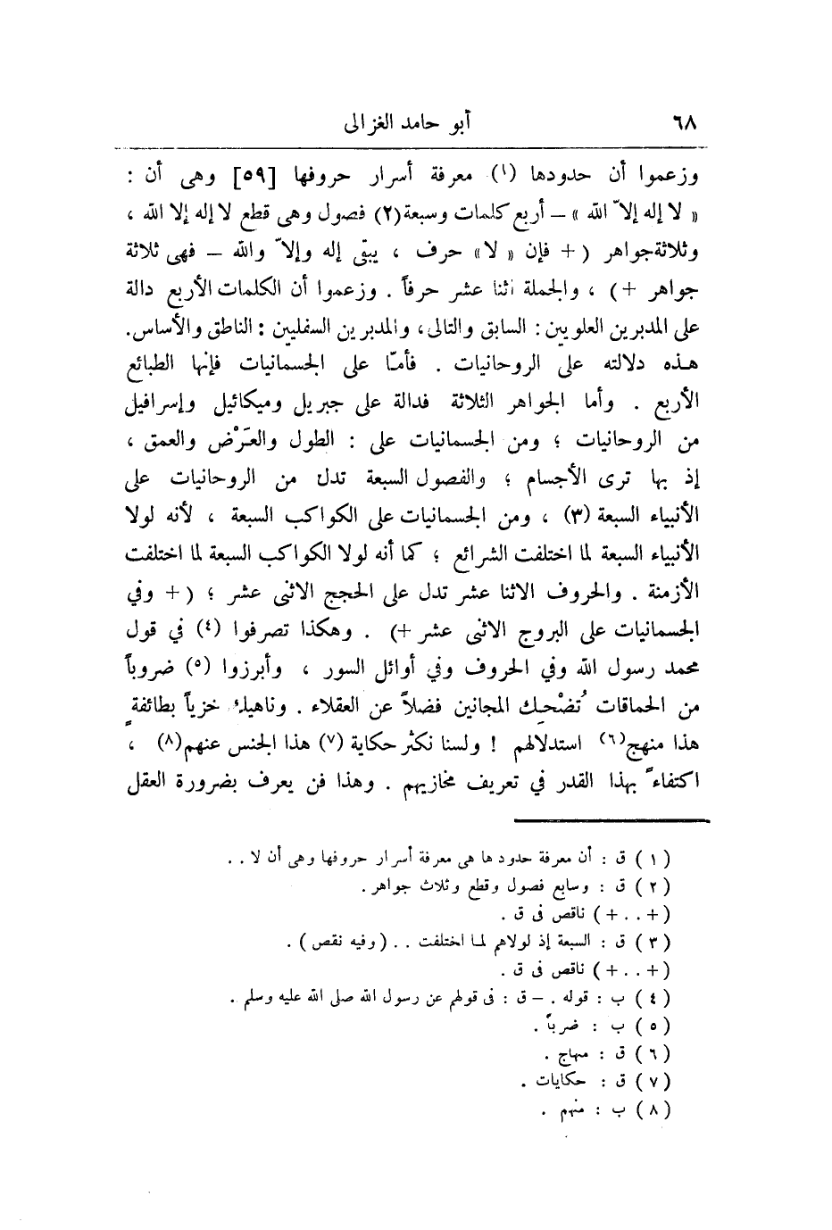 الْحق بِنَا غنية عَن مَعْرفَته فِي أَكثر الامور فَإِن جملَة التواريخ والاخبار الَّتِي كَانَت وستكون الى منقرض الْعَالم اَوْ هِيَ كائنة وَاقعَة الْيَوْم فِي الْعَالم يتَكَلَّم فِيهَا بِنَصّ واثبات وَالْحق وَاحِد وَلَا حَاجَة بِنَا الى مَعْرفَته وَهَذَا كَقَوْل الْقَائِل ملك الرّوم الان قَائِم ام لَا وَالْحق احدهما لَا محَالة مَا تَحت قدمي من الارض بعد مُجَاوزَة خَمْسَة اذرع حجر اَوْ تُرَاب وَفِيه دود ام لَا وَالْحق احدهما لَا محَالة وَمِقْدَار كرة الشَّمْس اَوْ زحل ومسافتهما مائَة فَرسَخ ام لَا وَالْحق احدهما وَهَكَذَا مساحات الْجبَال والبلاد وَعدد الْحَيَوَانَات فِي الْبر وَالْبَحْر وَعدد الرمل فَهَذِهِ كلهَا فِيهَا حق وباطل وَلَا حَاجَة الى مَعْرفَتهَا بل الْعُلُوم الْمَشْهُورَة من النَّحْو وَالشعر والطب والفلسفة وَالْكَلَام وَغَيرهَا فَمِنْهَا حق وباطل وَلَا حَاجَة بِنَا الى أَكثر مَا قيل فِيهَا بل الَّذِي نسلم انه لَا بُد من مَعْرفَته مَسْأَلَتَانِ وجود الصَّانِع تَعَالَى وَصدق الرَّسُول صلى الله عَلَيْهِ وَسلم وَهَذَا لَا بُد مِنْهُ ثمَّ إِذا اثْبتْ صدق الرَّسُول فالباقي يتَعَلَّق بِهِ تقليدا اَوْ علما بِخَبَر الْمُتَوَاتر اَوْ ظنا بِخَبَر الْوَاحِد وَذَلِكَ من الْعُلُوم كَاف فِي الدُّنْيَا وَالْآخِرَة وَمَا عداهُ مُسْتَغْنى عَنهُ أما وجود الصَّانِع وَصدق الرَّسُول فطريق مَعْرفَته النّظر فِي الْخلق حَتَّى يسْتَدلّ بِهِ على الْخَالِق وَفِي المعجزة حَتَّى يسْتَدلّ بهَا على صدق الرَّسُول وَهَذَانِ لَا حَاجَة فيهمَا الى معلم مَعْصُوم فان النَّاس فِيهِ قِسْمَانِ قسم اعتقدوا ذَلِك تقليدا وسماعا من ابويهم وصمموا عَلَيْهِ العقد قاطعين بِهِ وناطقين بقَوْلهمْ لَا اله إِلَّا الله مُحَمَّد رَسُول الله صلى الله عَلَيْهِ وَسلم من غيربحث عَن الطّرق البرهانية وَهَؤُلَاء هم الْمُسلمُونَ حَقًا وَذَلِكَ الِاعْتِقَاد يكفيهم وَلَيْسَ عَلَيْهِم