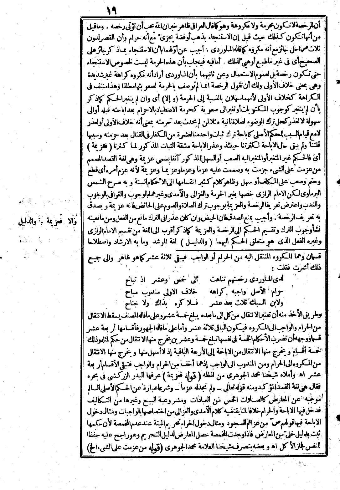 (والحكم) أي الشرعي إذ الكلام فيه (إن تغير) من حيث تعلقه من صعوبة له على المكلف (إلى سهولة) كأن تغير من حرمة شيء إلى حله (لعذر مع قيام السبب للحكم الأصلي) المتخلف عنه للعذر، (فرخصة) أي فالحكم السهل المذكور يسمى رخصة وهي بإسكان الخاء أكثر من ضمها لغة السهولة. (واجبة ومندوبة ومباحة. وخلاف الأولى) هذه الصفات اللازمة بيان لأقسام الرخصة الممثل لها على هذا الترتيب بقولي (كأكل ميتة لمضطر (وقصر) من مسافر بقيد زدته بقولي (بشرطه) بأن كره القصر أو شك في جوازه، وكان سفره يبلغ ثلاث مراحل فأكثر ولم يختلف في جواز قصره كما هو معلوم من محله، (وسلم) وهو بيع موصوف في الذمة بلفظ سلم (وفطر مسافر) في زمن صوم واجب أصالة أو بنذر أو قضاء ما فات بلا تعدّ (لا يضره الصوم) فإن ضره فالفطر أولى، والمعنى أن الرخصة كحل المذكورات من وجوب وندب وإباحة وخلاف الأولى وحكمها الأصلي الحرمة وأسبابها الخبث في الميتة، ودخول وقتي الصلاة والصوم في القصر والنظر لأنه سبب لوجوب الصلاة تامة والصوم والغرر في السلم، وهي قائمة حال الحل وأعذار الحل الاضطرار ومشقة السفر، والحاجة إلى ثمن الغلات قبل إدراكها، وسهولة الوجوب في أكل الميتة لموافقته غرض النفس في بقائها، وقيل إنه عزيمة لصعوبته ومن الرخصة المباحة إباحة ترك الجماعة في الصلاة لمرض أو نحوه، وحكمه الأصلي الكراهة وسببها قائم حال الإباحة، وهو الانفراد فيما يطلب فيه الاجتماع من شعائر الإسلام، وقد بينت في الحاشية كمية أقسام الرخصة الحاصلة بالانتقال من حكم إلى آخر، وقضية ما ذكر أن الرخصة لا تكون محرمة ولا مكروهة، وهو كما قال العراقي ظاهره، خبر «إنَّ اللَّهُ يُحِبُّ أَنْ تُؤْتَى رُخصه» . وما قيل من أنها تكون كذلك حيث قيل إن الاستنجاء بذهب أو فضة يجزىء مع أنه حرام، وأن القصر لدون ثلاث مراحل جائز مع أنه مكروه كما قاله الماوردي. أجيب عن أولهما بأن الاستنجاء بما ذكر جائز على