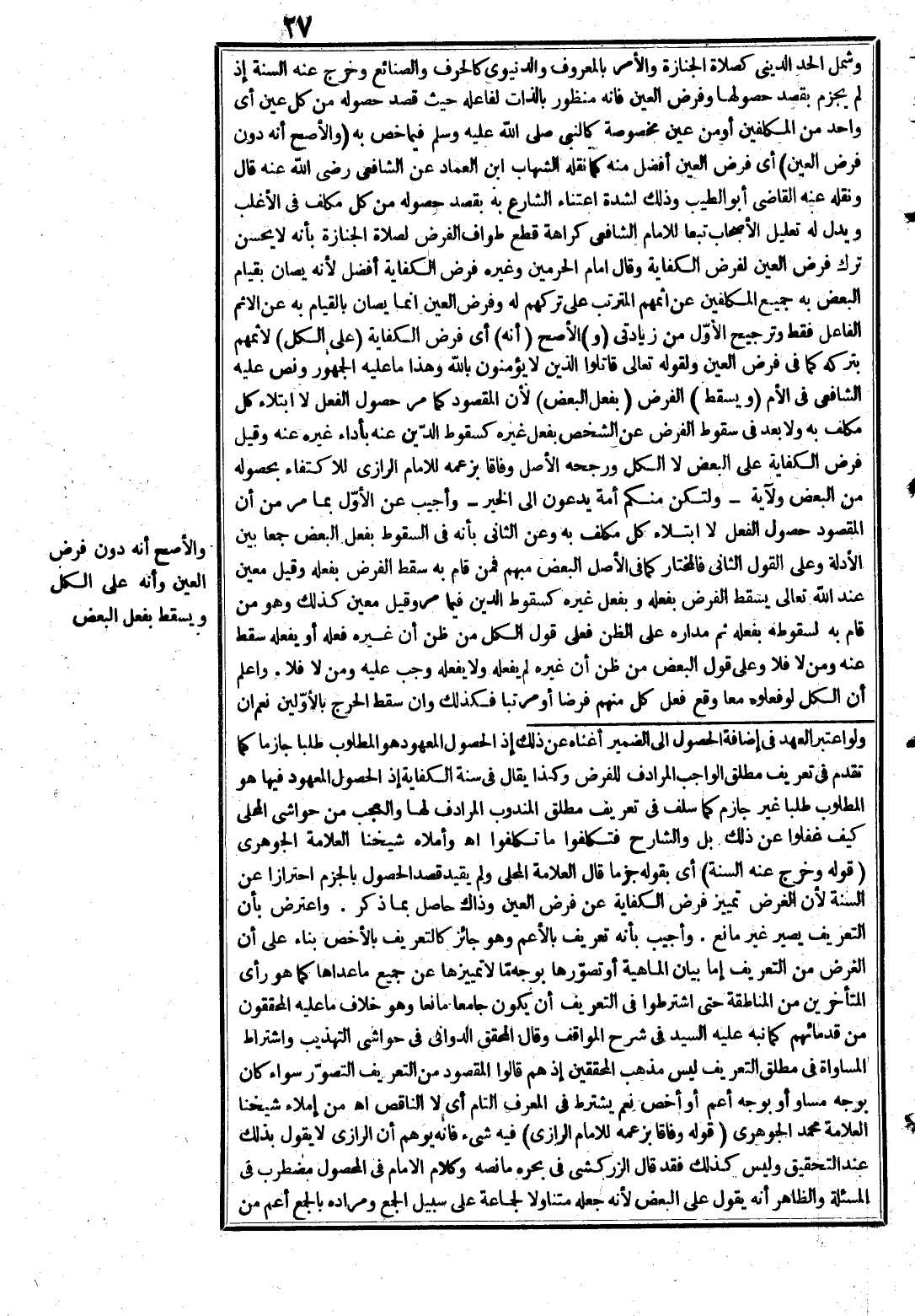 المثاب عليه ثواب الواجب الذي هو كثواب سبعين مندوبا (أولها) وإن تفاوتت لتأدّى الواجب به من حيث إنه مبهم. (أو) فعلها كلها (معا فأعلاها) ثوابا الواجب لأنه لو اقتصر لأثيب عليه ثواب الواجب الأكمل فضمّ غيره إليه لا ينقصه عن ذلك. (وإن تركها) كلها (عوقب بأدناها) عقابا إن عوقب، لأنه لو فعله فقط من حيث إنه مبهم لم يعاقب، فإن تساوت وفعلت معا أو تركت فثواب الواجب والعقاب على واحد منها. وقيل الواجب فيما إذا تفاوتت أعلاها ثوابا، وفيما إذا تساوت أحدها وإن فعلت مرتبة فيهما لما مر، فإن تركت فحكمه موافق للمختار ويثاب ثواب المندوب في كل قول على غير ما ذكر لثواب الواجب، وذكر حكم التساوي في المرتبة مع الترجيح في البقية من زيادتي المقتضية من حيث الترجيح لإبدال قوله في المرتبة أعلاها بقولي أولها، وبما قررته علم أن محل ثواب الواجب والعقاب أحدها مبهما لا من حيث خصوصه، حتى إن الواجب ثوابا في المرتبة أولها من حيث إنه مبهم لا من حيث خصوصه، وكذا يقال في كل من الزائد على ما يتأدّى به الواجب، منها أنه يثاب عليه ثواب المندوب من حيث إنه مبهم لا من حيث خصوصه. (ويجوز تحريم واحد مبهم) من أشياء معينة (عندنا) نحو لا تتناول السمك أو اللبن أو البيض، فعلى المكلف تركه في أي معين منها، وله فعله في غيره، إذ لا مانع من ذلك ومنعه المعتزلة كمنعهم إيجابه لما مر عنهم فيهما. وزعمت طائفة منهم أنه لم ترد به اللغة، وهذا (كـ) ـالواجب (المخير) فيما مر فيه فالنهي عن واحد مبهم مما ذكر يحرّمه مبهما. وقيل يحرمه معينا عند الله تعالى ويسقط تركه الواجب بتركه أو ترك غيره منها. فالتارك لبعضها إن صادف المحرم فذاك، وإلا فقد ترك بدله، وقيل يحرمه كذلك وهو ما يختاره المكلف، وقيل يحرمها كلها فيعاقب بفعلها عقاب فعل محرمات ويثاب بتركها امتثالاً ثواب ترك محرمات، ويسقط تركها الواجب بترك واحد منها، فعلى الأول إن تركها كلها امتثالاً وتفاوتت، فالمختار أنه يثاب على ترك أشدها عقابا وإن فعلها مرتبة عوقب على آخرها، وإن تفاوتت لارتكابه المحرم به أو فعلها معا عوقب على أخفها عقابا،