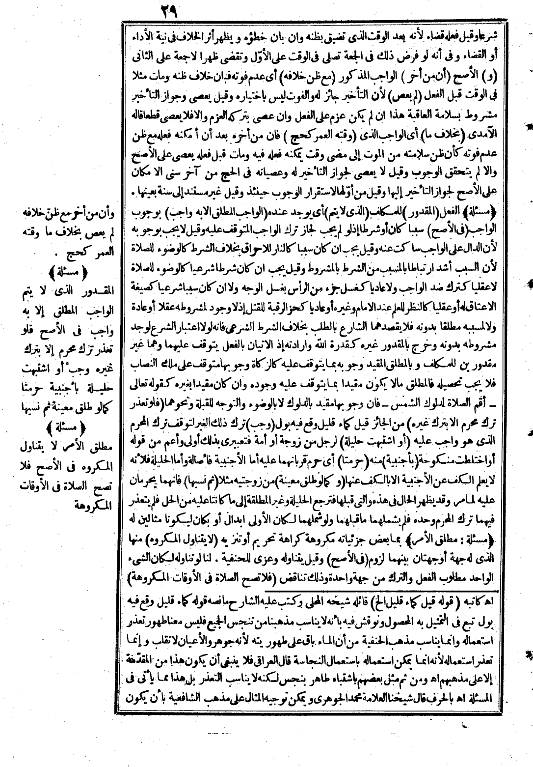 (مسألة: الأصح أن وقت) الصلاة (المكتوبة) كالظهر (جوازا وقت لأدائها) ففي أي جزء منه أوقعت، فقد أوقعت في وقت أدائها الذي يسعها وغيرها، ولهذا يعرف بالواجب الموسع، وقولي جوازا راجع إلى الوقت لبيان أن الكلام في وقت الجواز لا في الزائد عليه أيضا من وقتي الضرورة والحرمة، وإن كان الفعل فيهما أداء بشرطه. وقيل وقت أدائها أول الوقت فإن أخرت عنه فقضاء وإن فعل في الوقت حتى يأثم بالتأخير عن أوله، وقيل هو آخر الوقت فإن قدمت عليه فتقديمها تعجيل، وقيل هو الجزء الذي وقعت فيه من الوقت وإن لم تقع فيه فوقت أدائها الجزء الأخير من الوقت، وقيل إن قدمت على آخر الوقت وقعت واجبة بشرط بقاء الفاعل مكلفا إلى آخر الوقت فإن لم يبق كذلك وقعت نفلاً. وهذه الأقوال الأربعة منكرة للواجب الموسع. (و) الأصح (أنه) أي الشأن (يجب على المؤخر) أي مريد التأخير عن أول الوقت الذي هو سبب الوجوب (العزم) فيه على الفعل في الوقت كما صححه النووي في مجموعه، ونقله غيره عن أصحابنا ليتميز به التأخير الجائز عن غيره وتأخير الواجب الموسع عن المندوب في جواز التأخير عن أول الوقت، وقيل لا يجب اكتفاء بالفعل، ورجحه الأصل وزعم أن الأول لا يعرف إلا عن القاضي أبي بكر الباقلاني ومن تبعه، وأنه من هفوات القاضي ومن العظائم في الدين.