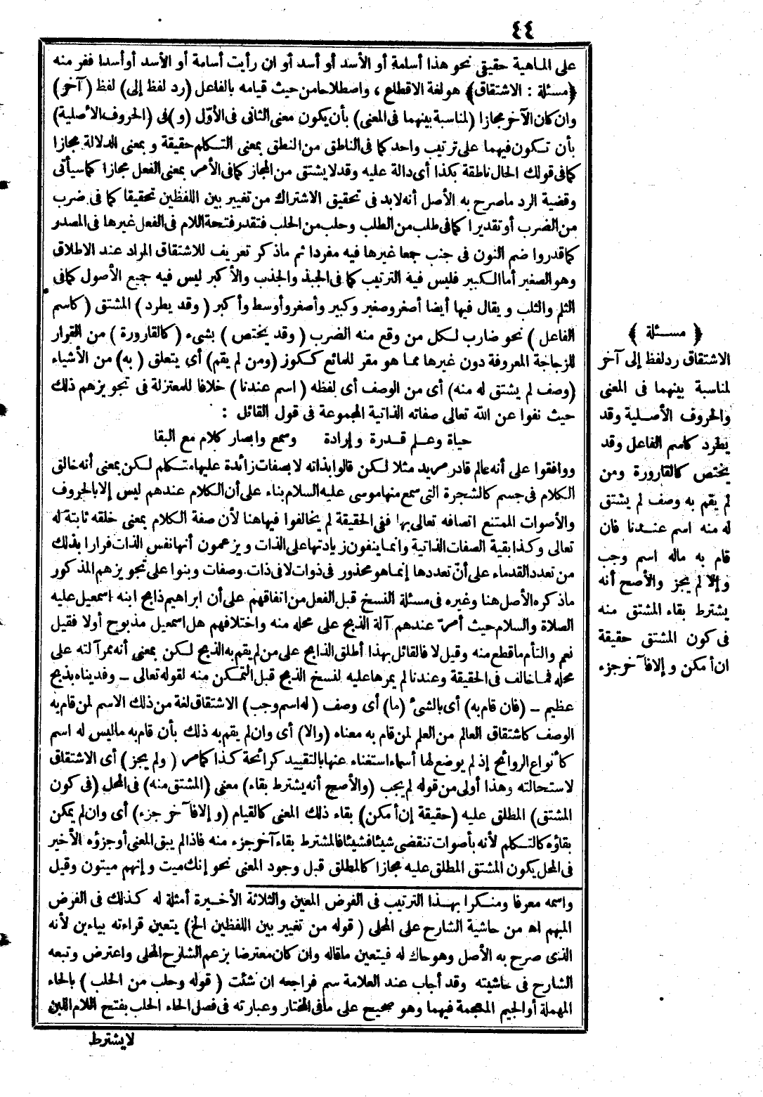 (مسألة اللفظ) المفرد (والمعنى إن اتحدا) بأن كان كل منهما واحدا (فإن منع تصوّر معناه) أي معنى اللفظ المذكور (الشركة) فيه من اثنين مثلاً (فجزئي) أي فذلك اللفظ يسمى جزئيا حقيقيا كزيد. (وإلا) أي وإن لم يمنع تصوّر معناه الشركة فيه (فكلي) سواء امتنع وجود معناه كالجمع بين الضدين أم أمكن ولم يوجد منه كبحر زئبيق أو وجد وامتنع غيره كالإله أي المعبود بحق، أو أمكن ولم يوجد كالشمس أي الكوكب النهاري المضيء، أو وجد كالإنسان أي الحيوان الناطق، وما مر من تسمية المدلول جزئيا وكليا هو الحقيقة، وما هنا مجاز من تسمية الدال باسم المدلول. (متواطىء) ذلك الكلي. (إن استوى) معناه في أفراده كالإنسان فإنه متساوي المعنى في أفراده من زيد وعمرو وغيرهما سمي متواطئا من التواطؤ أي التوافق لتوافق أفراد معناه فيه. (وإلا) فإن تفاوت معناه في إفراده بالشدة أو التقدم كالبياض، فإن معناه في الثلج أشد منه في العاج، وكالوجود فإن معناه في الواجب قبله في الممكن، (فمشكك) سمي به لتشكيكه الناظر فيه في أنه متواطىء نظرا إلى جهة اشتراك الأفراد في أصل المعنى أو غير متواطىء نظرا إلى جهة الاختلاف. (وإن تعددا) أي اللفظ والمعنى كالإنسان والفرس. (فمباين) أي كل من اللفظين للآخر مباينا له لمباينة معنى كل منهما لمعنى الآخر. (أو) تعدد (اللفظ فقط) أي دون المعنى كالإنسان والبشر. (فمرادف) كل من اللفظين للآخر سمى مرادفا له لمرادفته له أي موافقته له في معناه. (وعكسه) وهو أن يتعدد المعنى دون اللفظ كأن يكون للفظ معنيان.