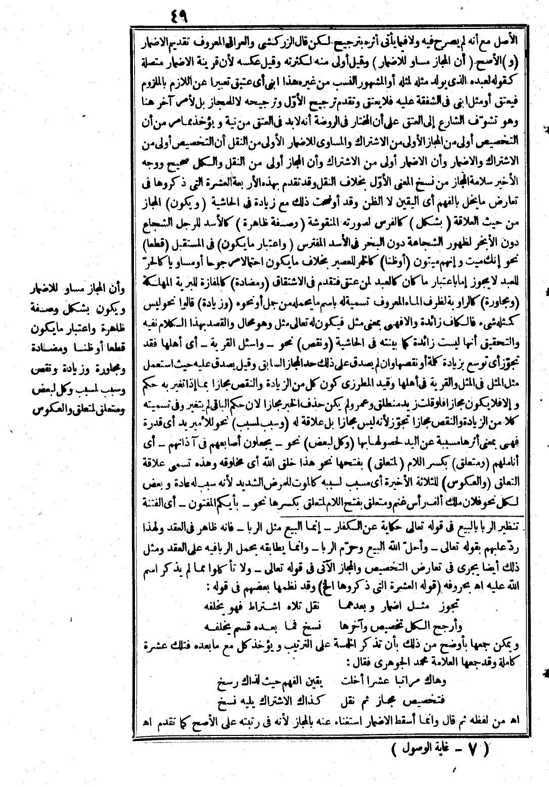 (وهو) أي المجاز (واقع) في الكلام مطلقا (في الأصح) ونفى قوم وقوعه مطلقا قالوا وما يظنّ مجازا نحو رأيت أسدا يرمى فحقيقة، ونفي قوم وقوعه في الكتاب والسنة قالوا لأنه بحسب الظاهر كذب نحو قولك في البليد هذا حمار، وكلام الله ورسوله منزه عن الكذب. وأجيب بأنه لا كذب مع اعتبار العلاقة وهي في ذلك المشابهة في الصفة الظاهرة أي عدم الفهم. (و) إنما (يعدل إليه) عن الحقيقة التي هي الأصل (لثقل الحقيقة) على اللسان كالخنفقيق للداهية يعدل عنه إلى الموت مثلاً. (أو بشاعتها) كالخرأة بكسر الخاء يعدل عنها إلى الغائط وحقيقته المكان المطمئن (أو جهلها) للمتكلم أو المخاطب دون المجاز. (أو بلاغته) نحو زيد أسد فإنه أبلغ من شجاع. (أو شهرته) دون الحقيقة. (أو غير ذلك) كإخفاء المراد عن غير المتخاطبين الجاهل بالمجاز دون الحقيقة وكإقامة وزن وقافية وسجع به دون الحقيقة. (والأصح أنه) أي المجاز (ليس غالبا على الحقيقة) في اللغات،