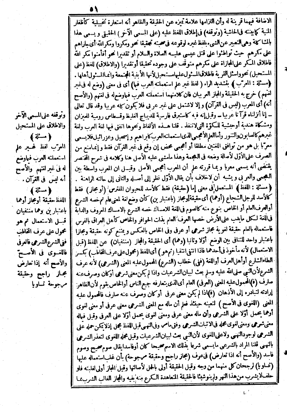 (ويكون) المجاز من حيث العلاقة (بشكل) كالفرس لصورته المنقوشة (وصفة ظاهرة) كالأسد للرجل الشجاع دون الأبخر لظهور الشجاعة دون البخر للأسد المفترس. (واعتبار ما يكون) في المستقبل (قطعا) نحو {إنك ميت وإنهم ميتون} (أو ظنا) كالخمر للعصير بخلاف ما يكون احتمالاً مرجوحا أو مساويا كالحرّ للعبد لا يجوز أما باعتبار ما كان كالعبد لمن عتق فتقدم في الاشتقاق. (ومضادة) كالمفازة للبرّية