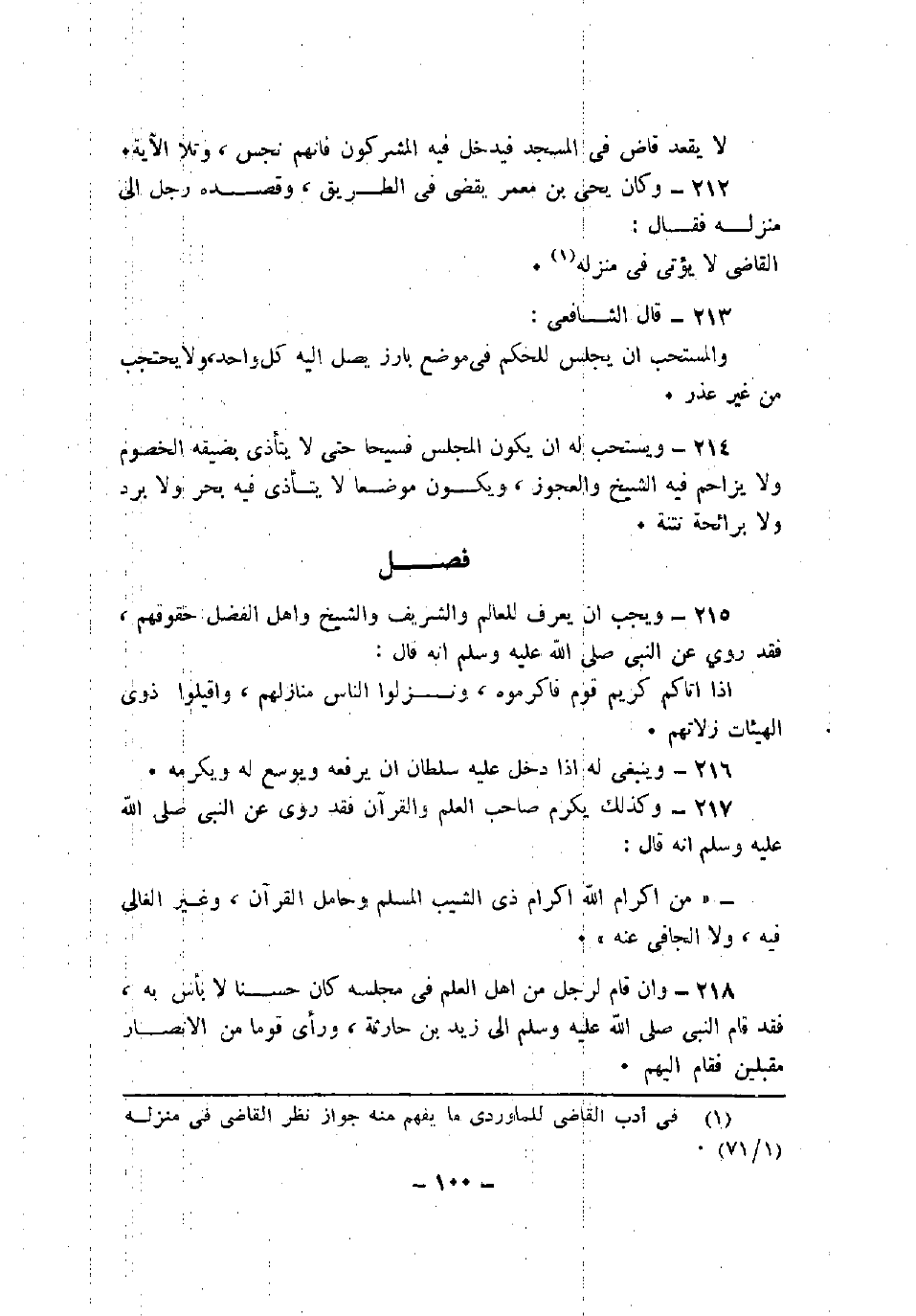 214 - ويستحب له أن يكون المجلس فسيحًا حتى لا يتأذى بضيقه الخصوم ولا يزاحم فيه الشيخ والعجوز، ويكون موضعًا لا يتأذى فيه بحر ولا برد ولا برائحة نتنة.