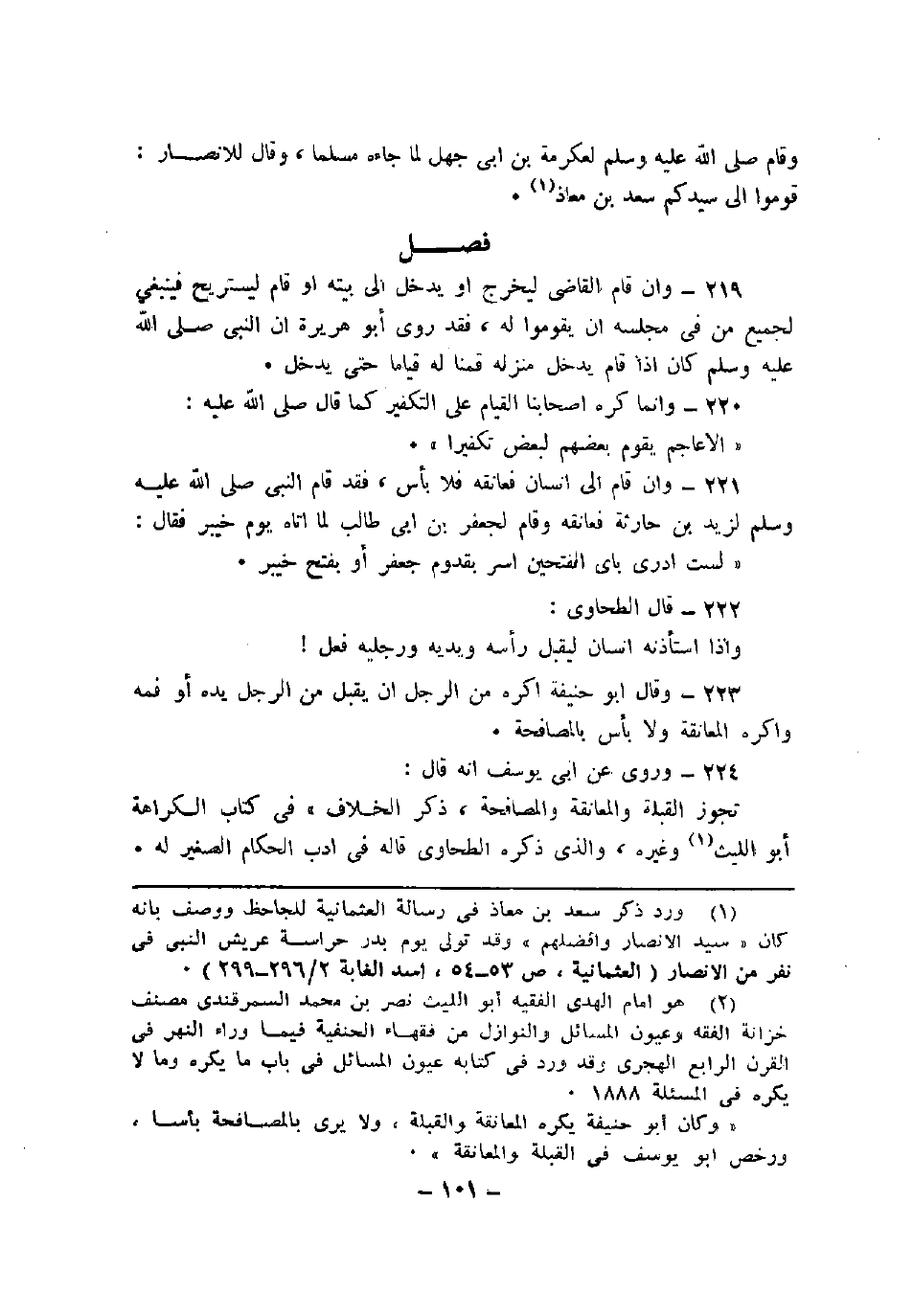 223 - وقال أبو حنيفة أكره من الرجل أن يقبل من الرجل يده أو فمه وأكره المعانقة ولا بأس بالمصافحة.