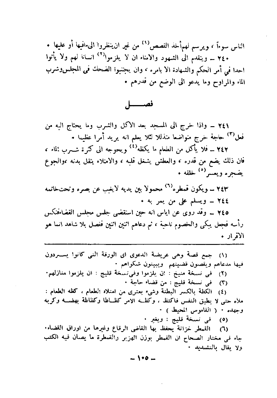 240 - ويتقدم إلى الشهود والأمناء أن لا يلزموا إنسانًا لهم ولا يأتوا أحدًا في أمر الحكم والشهادة إلا بأمره، وأن يجتنبوا الضحك في المجلس وشرب الماء والمراوح وما يدعو إلى الوضع من قدرهم.