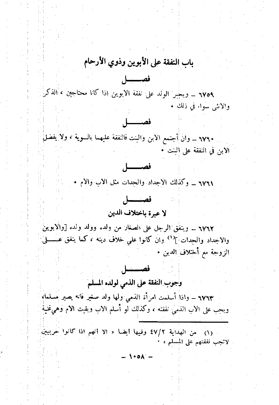 6762 - وينفق الرجل على الصغار من ولده وولد ولده [والأبوين والأجداد والجدات] وأن كانوا على خلاف دينه، كما ينفق على الزوجة مع اختلاف الدين.