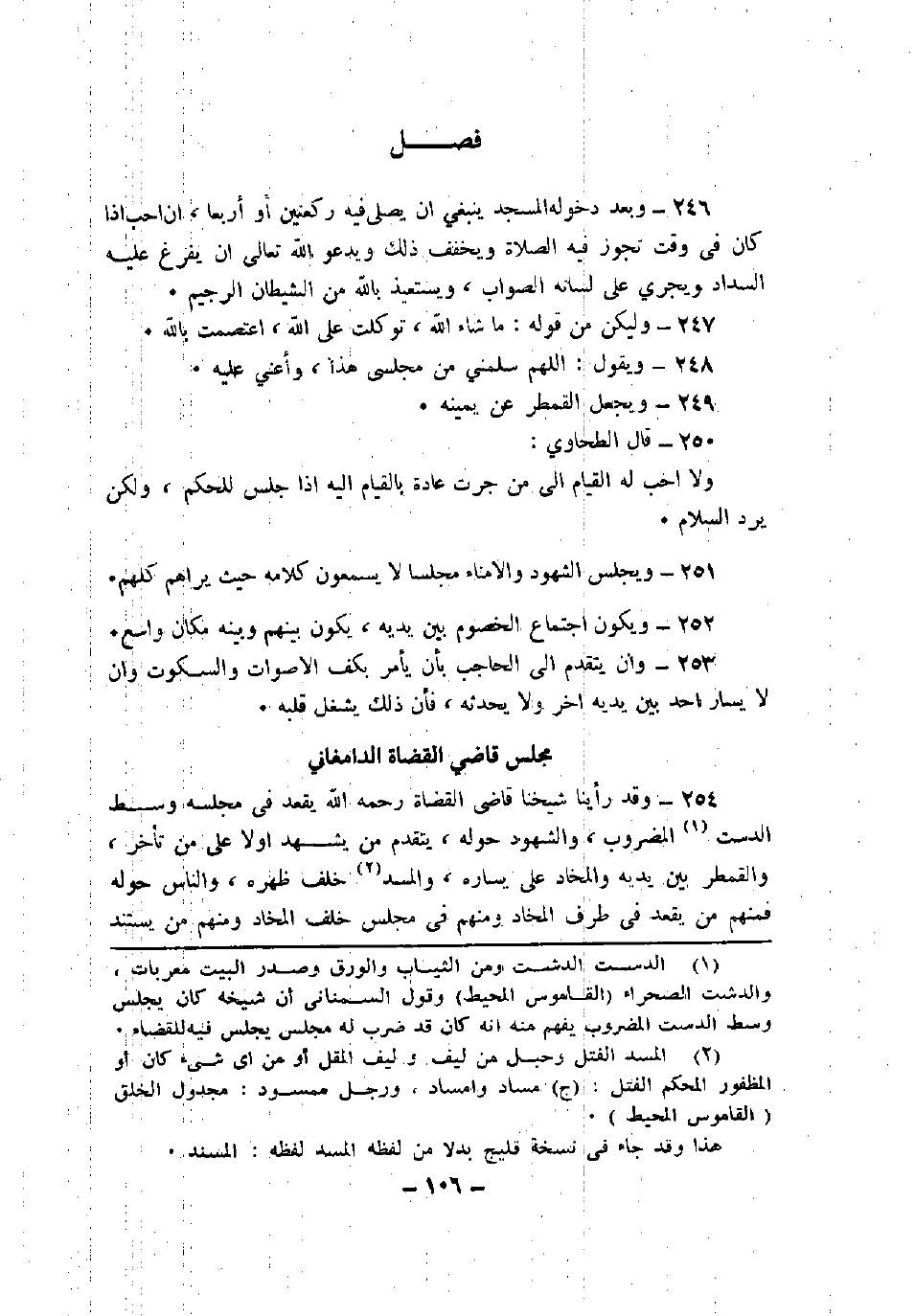 254 - وقد رأينا شيخنا قاضي القضاة رحمه الله يقعد في مجلسه وسط الدست المضروب، والشهود حوله، يتقدم من يشهد أولاً على من تأخر، والقمطر بين يديه والمخاد على يساره، والمسد خلف ظهره، والناس حوله فمنهم من يقعد في طرف المخاد ومنهم في مجلس خلف المخاد ومنهم من يستند