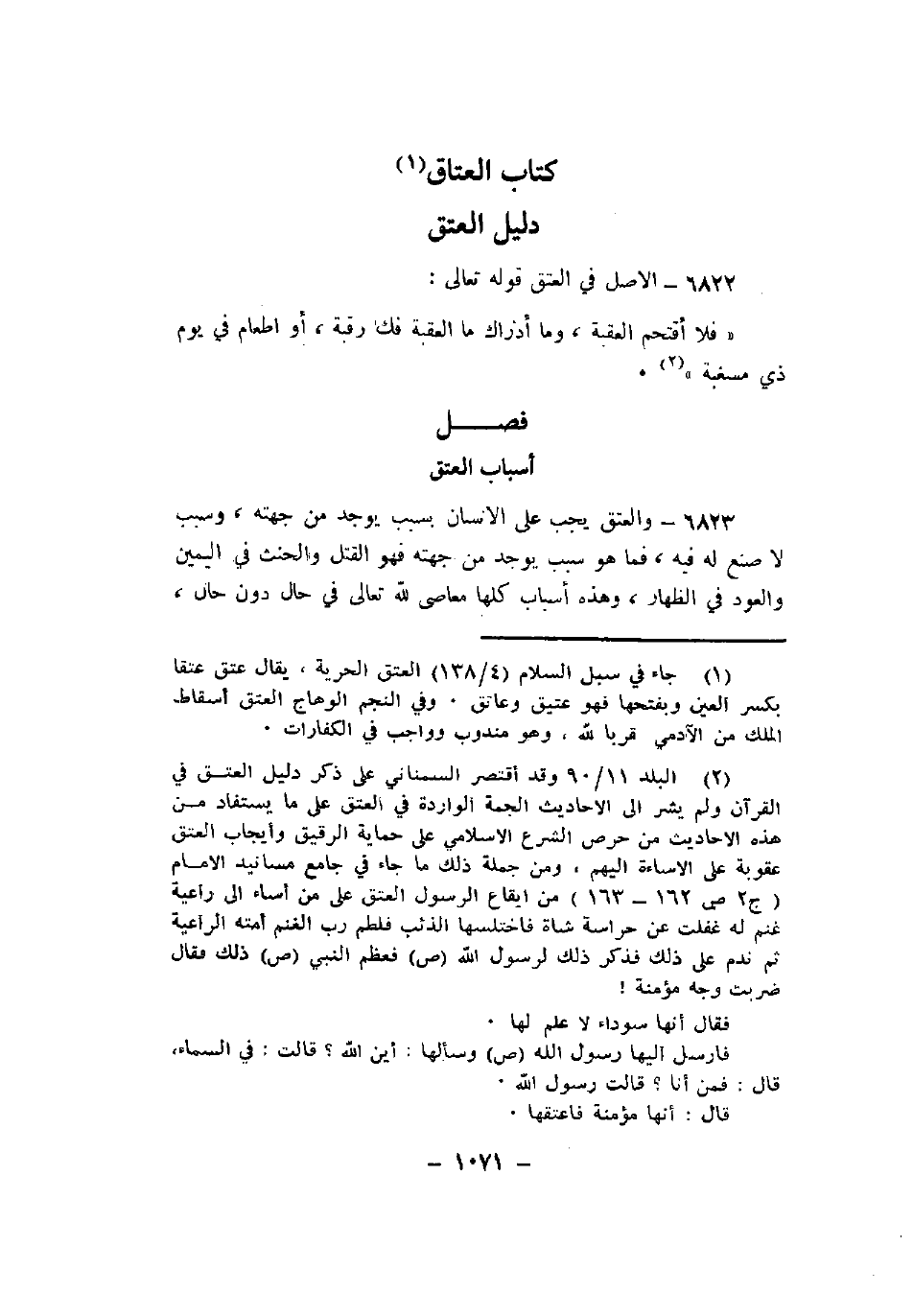 6823 - والعتق يجب على الإنسان بسبب يوجد من جهته، وسبب لا صنع له فيه، فما هو سبب يوجد من جهته فهو القتل والحنث في اليمين والعود في الظهار، وهذه أسباب كلها معاصي لله تعالى في حال دون حال،
