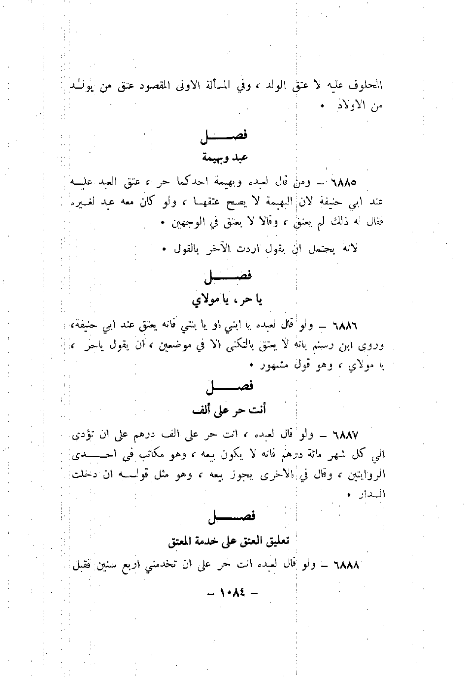 6886 - ولو قال لعبده يا ابني أو يا بنتي فأنه يعتق عند أبي حنيفة، وروى ابن رستم بأنه لا يعتق بالتكني إلا في موضعين، أن يقول يا حر، يا مولاي، وهو قول مشهور.