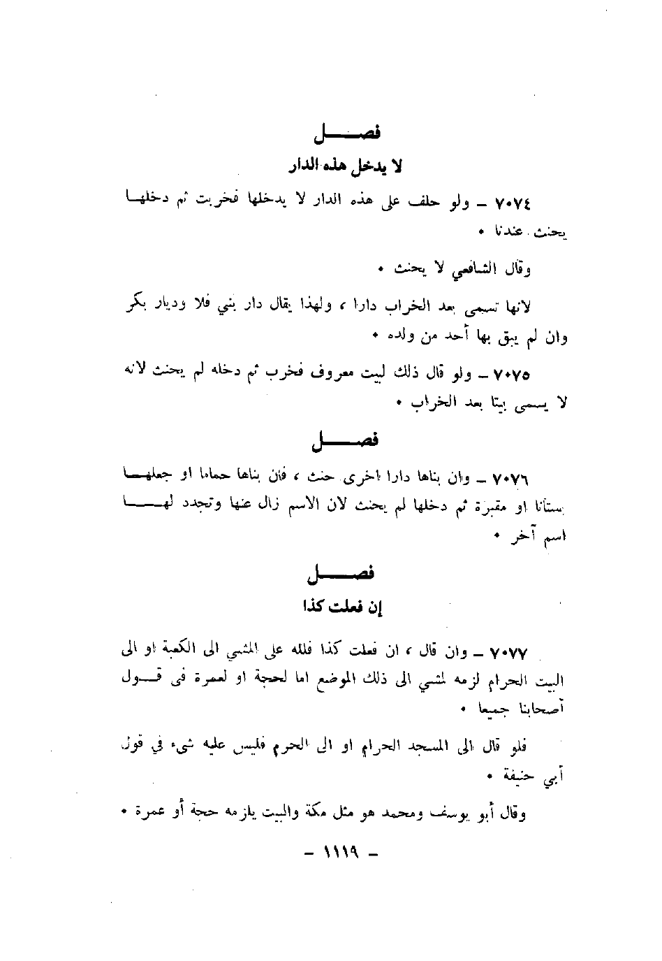 7077 - وإن قال، إن فعلت كذا فلله على المشي إلى الكعبة أو إلى البيت الحرام لزمه المشي إلى ذلك الموضع أما لحجة أو لعمرة في قول أصحابنا جميعا.