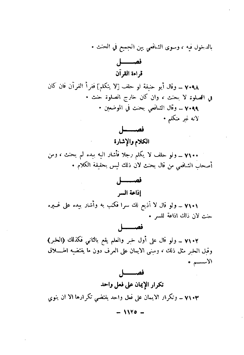7098 - وقال أبو حنيفة لو حلف [لا يتكلم] فقرأ القرآن فإن كان في الصلوة لا يحنث، وإن كان خارج الصلوة حنث.