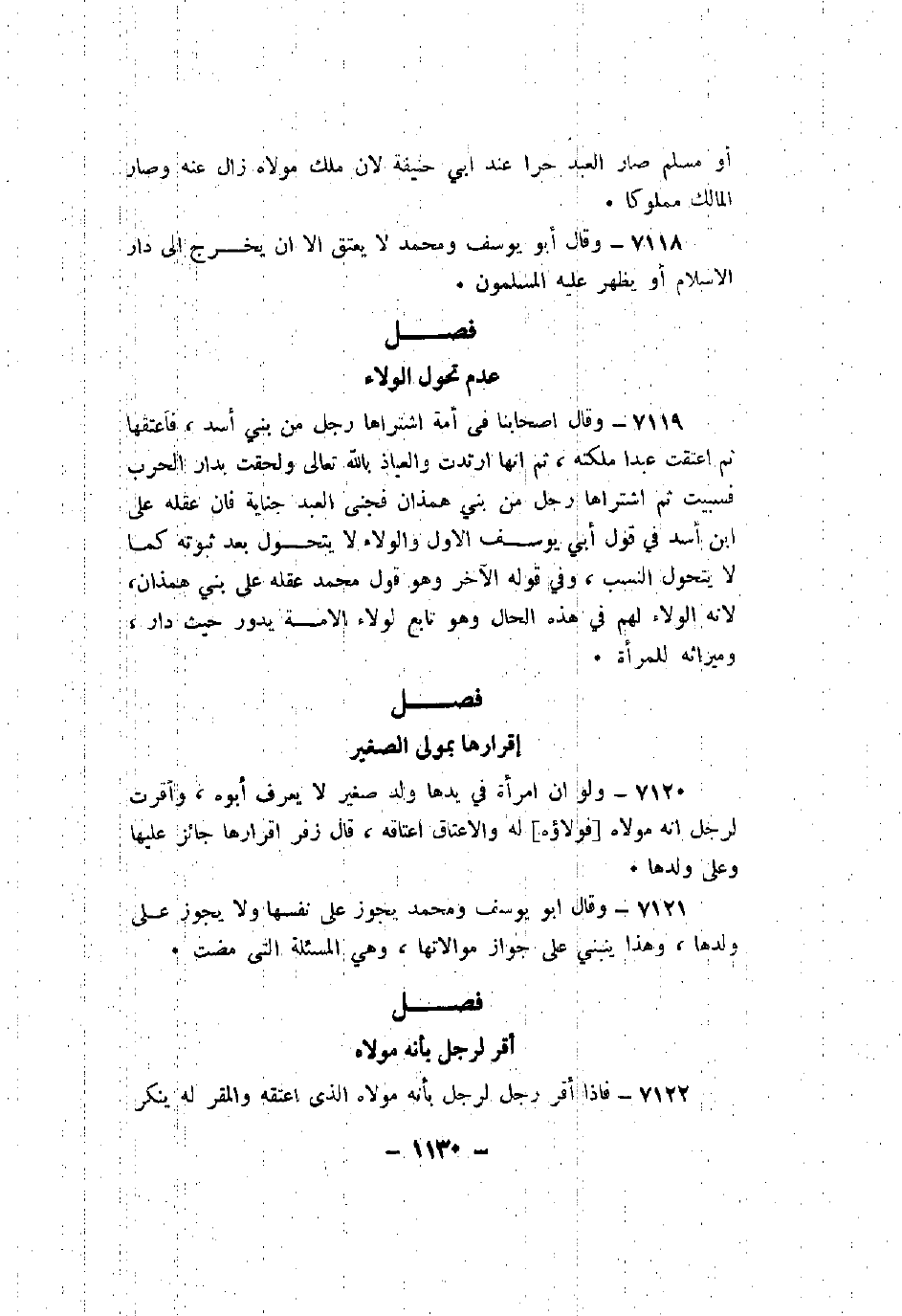 7119 - وقال أصحابنا في أمة اشتراها رجل من بني أسد، فاعتقها ثم أعتقت عبدا ملكته، ثم أنها ارتدت والعياذ بالله تعالى ولحقت بدار الحرب فسبيت ثم اشتراها رجل من بني همذان فجني العبد جناية فإن عقله على ابن أسد في قوله أبي يوسف الأول والولاء لا يتحول بعد ثبوته كما لا يتحول النسب، وفي قوله الآخر وهو فول محمد عقله على بني همذان، لأن الولاء لهم في هذه الحال وهو تابع لولاء الأمة يدور حيث دار، وميراثه للمرأة.
