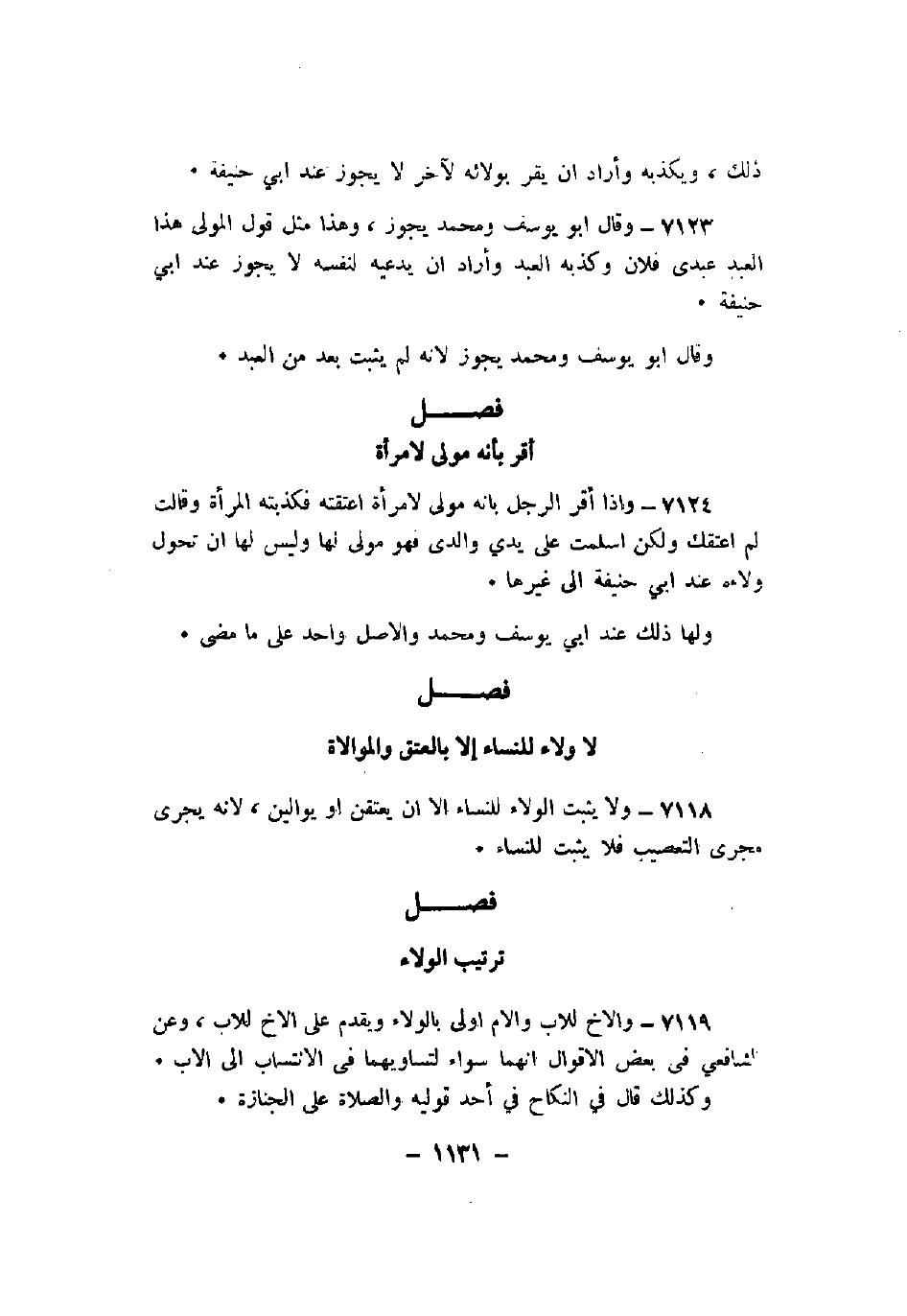 7118 - ولا يثبت الولاء للنساء إلا أن يعتقن أو يوالين، لأنه يجرى مجرى التعصيب فلا يثبت للنساء.