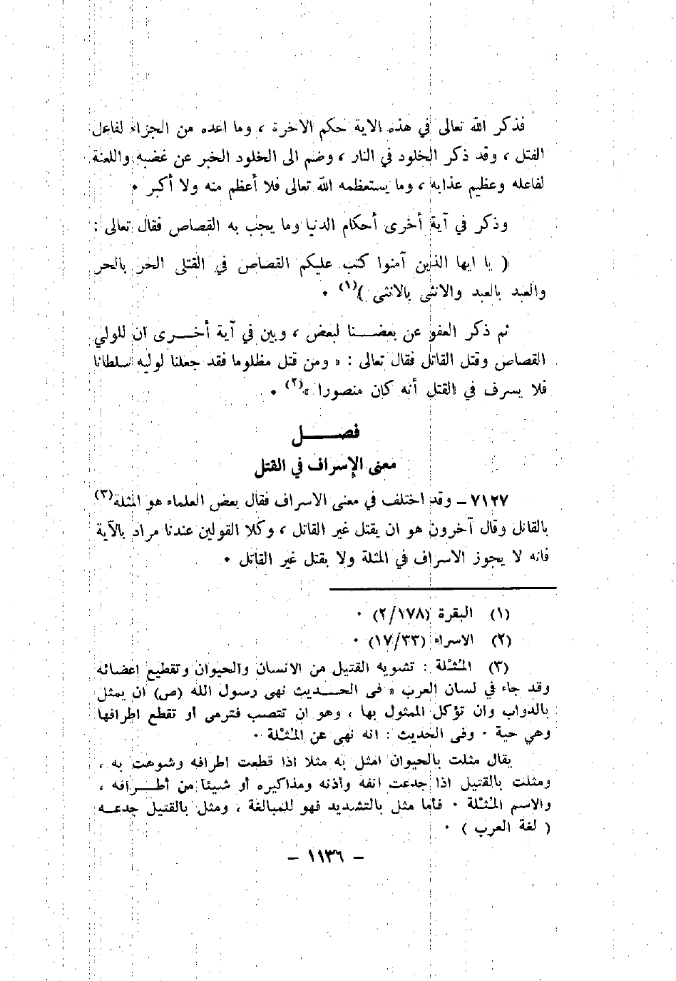7127 - وقد اختلف في معنى الإسراف فقال بعض العلماء هو المثلة بالقائل وقال آخرون هو أن يقتل غير القاتل، وكلا القولين عندنا مراد بالآية فإنه لا يجوز الإسراف في المثلة ولا بقتل غير القاتل.