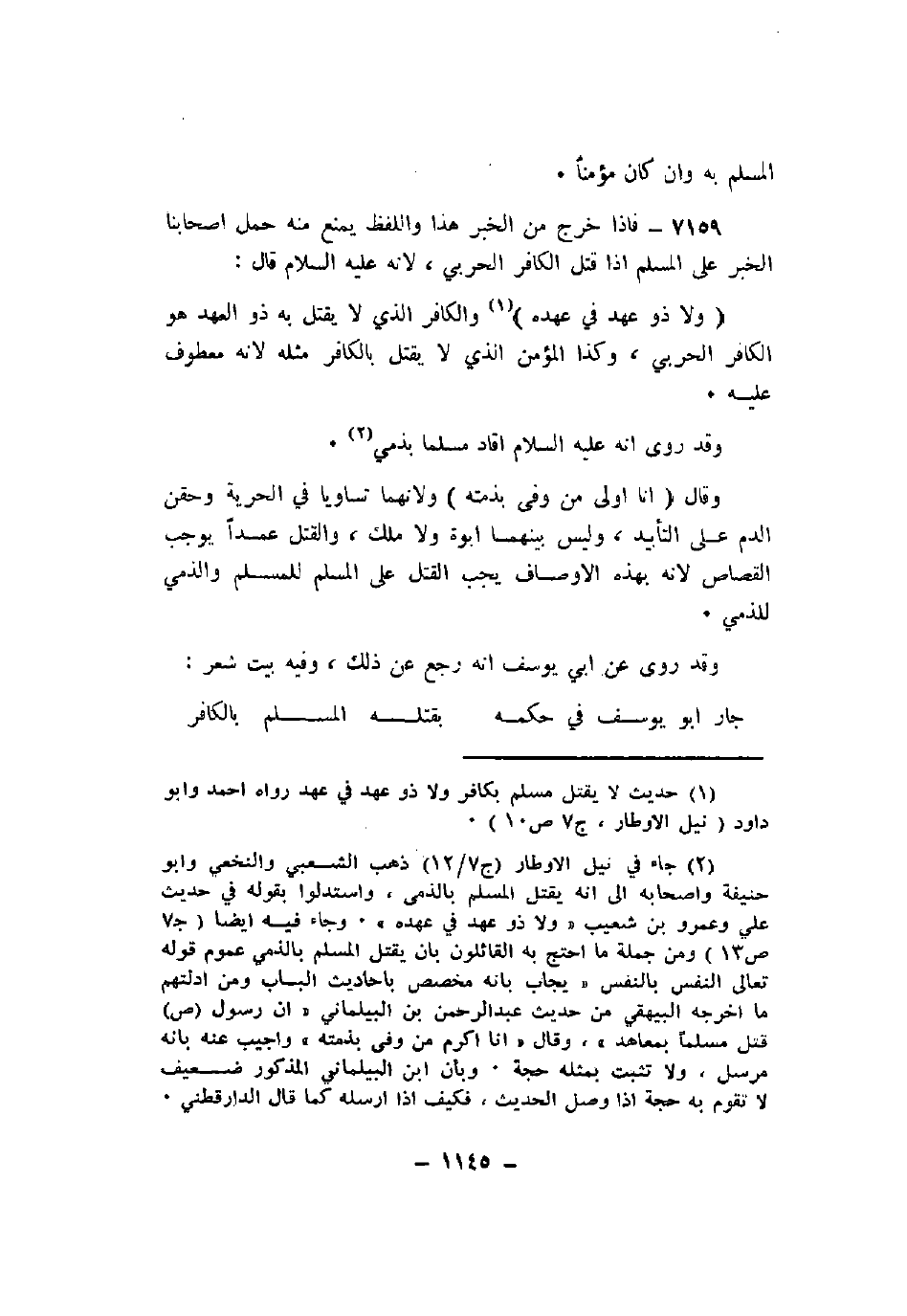 7159 - فإذا خرج من الخبر هذا واللفظ يمنع منه حمل أصحابنا الخبر على المسلم إذا قتل الكافر الحربي، لأنه عليه السلام قال «ولا ذو عهد في عهده» والكافر الذي لا يقتل به ذو العهد هو الكافر الحربي، وكذا المؤمن الذي لا يقتل بالكافر مثله لأنه معطوف عليه.